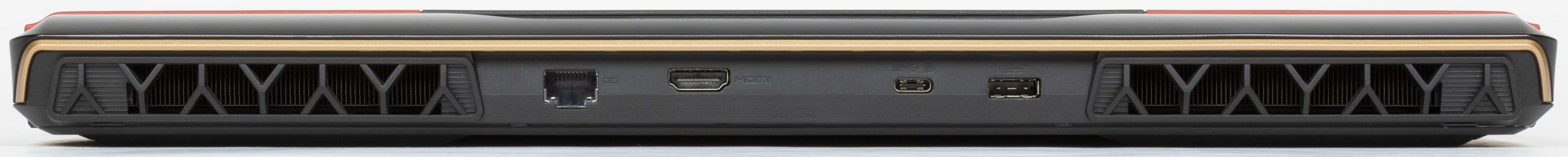 Часть разъемов очень разумно вывели на задний торец: гнездо для внешнего адаптера питания, еще один порт USB 3.2 Gen2 Type-C (для него также заявлена поддержка функции DisplayPort, но во время тестирования этого не обнаружено), полноразмерные розетка RJ-45 и порт HDMI 2.1.