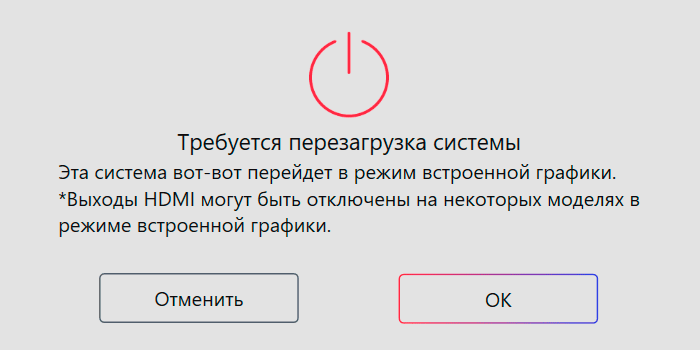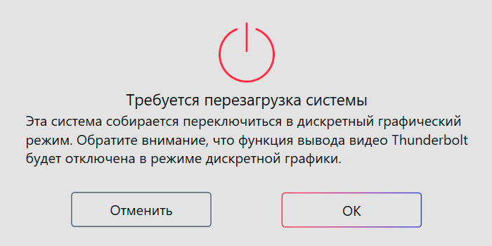 После смены установки GPU Switch выдается окно с предупреждением, затем происходит автоматическая перезагрузка. Сделанный выбор остается после перезагрузки ноутбука, даже если автозагрузка утилиты отключена.