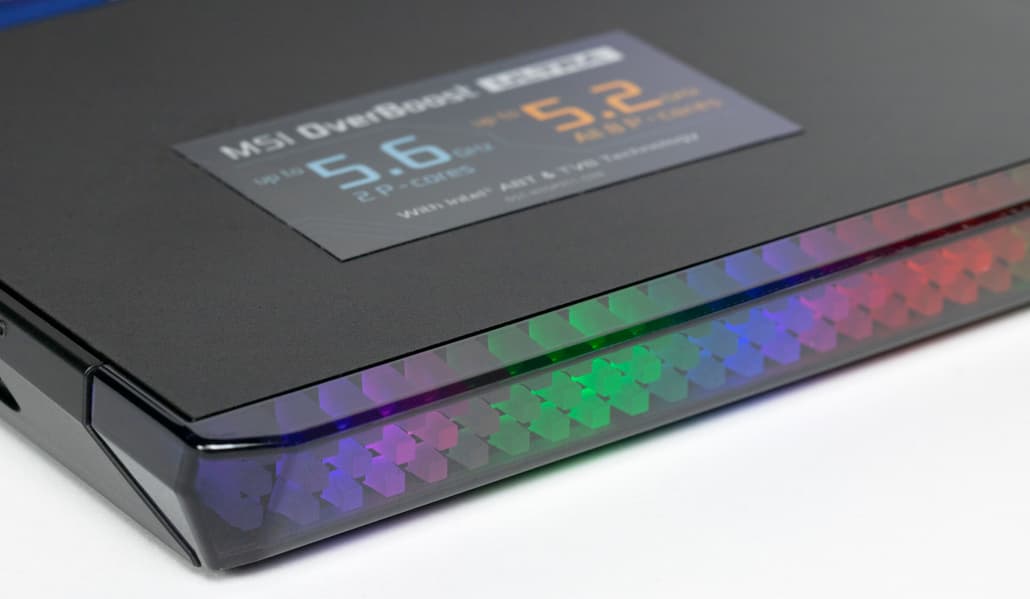 Кроме RGB-подсветки клавиатуры, в ноутбуке есть чисто декоративные светящиеся элементы: полоса по всей длине передней кромки и логотип на верхней крышке.