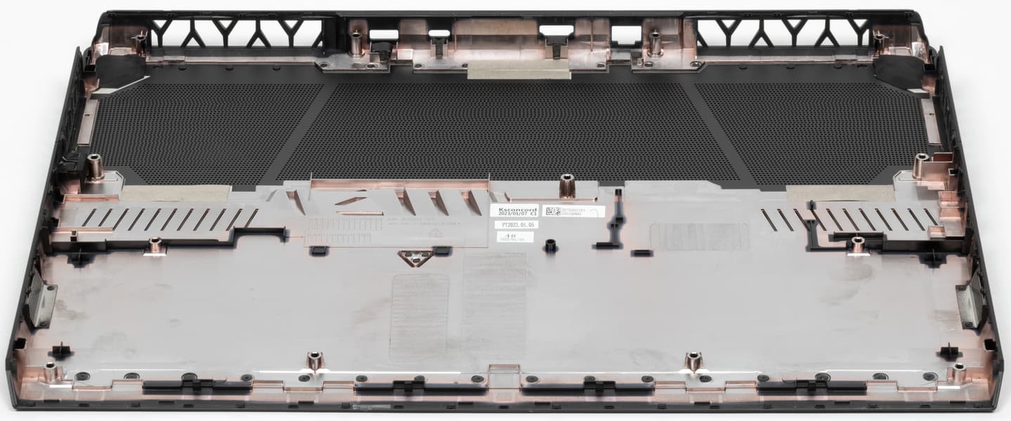 Днище имеет на редкость сложный рельеф, различных декоративных элементов там чуть ли не больше, чем на верхней крышке. Кроме продолговатых и довольно жестких ножек (спереди одна длинная, сзади две покороче), есть дополнительный пластиковый выступ V-образной формы, повышающий жесткость при установке на твердую поверхность. Почти половину занимает сетчатая металлическая вставка с множеством крошечных вентиляционных отверстий, через них происходит забор воздуха для охлаждения компонентов. Перекрыть значительную их часть коленями при соответствующем варианте размещения получится вряд ли, но ставить ноутбук на мягкую поверхность всё же не следует.