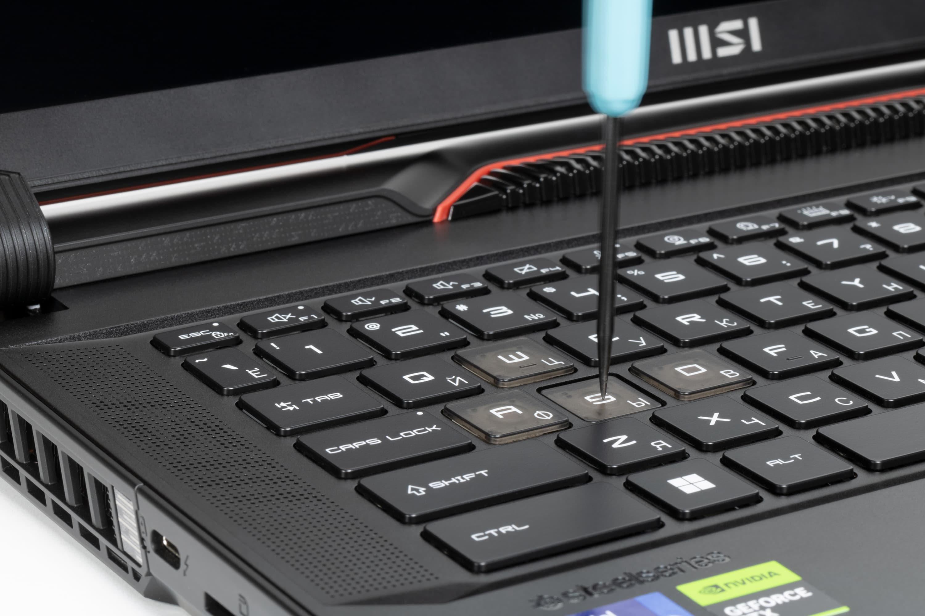 Клавиатура очень похожа на те, что мы видели в различных современных моделях игровых ноутбуков MSI: полноразмерная, с трехрядным цифровым блоком, мембранного типа с островным расположением кнопок.