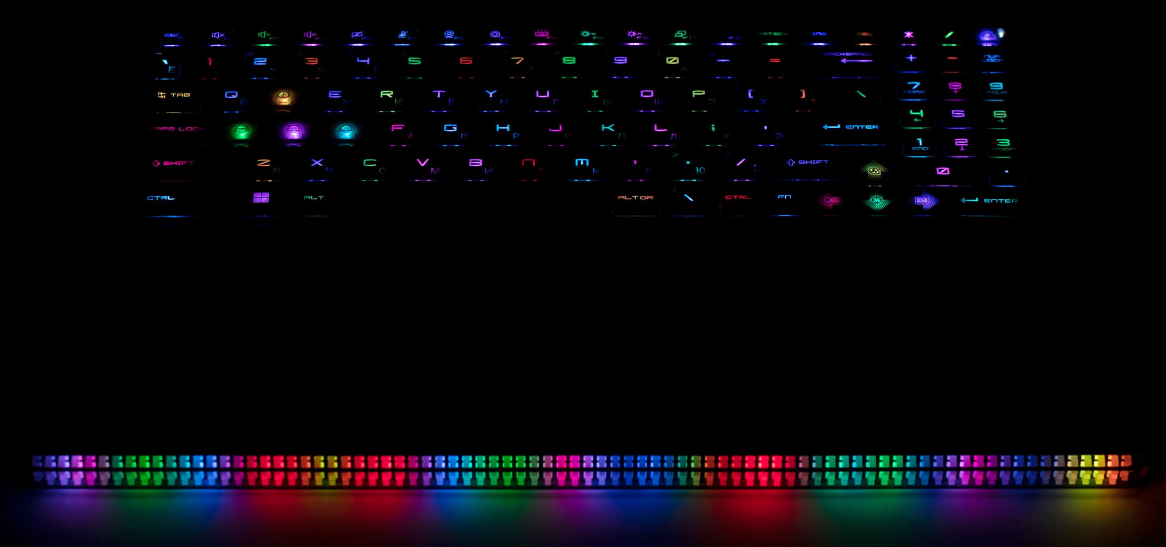 А после включения можно задействовать RGB-подсветку, о которой расскажем при описании соответствующей управляющей утилиты, и тогда неприметным ноутбук точно не назовешь: с установками по умолчанию получается что-то вроде переливающейся разноцветными огоньками новогодней елки — детишки-дошкольники будут в восторге.