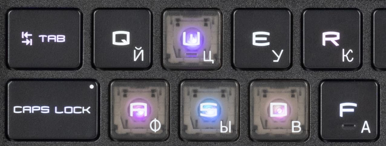 В некоторые клавиши встроены крошечные индикаторы белого цвета, они отображают соответствующие режимы (Caps Lock, отключение динамиков и т. д.).