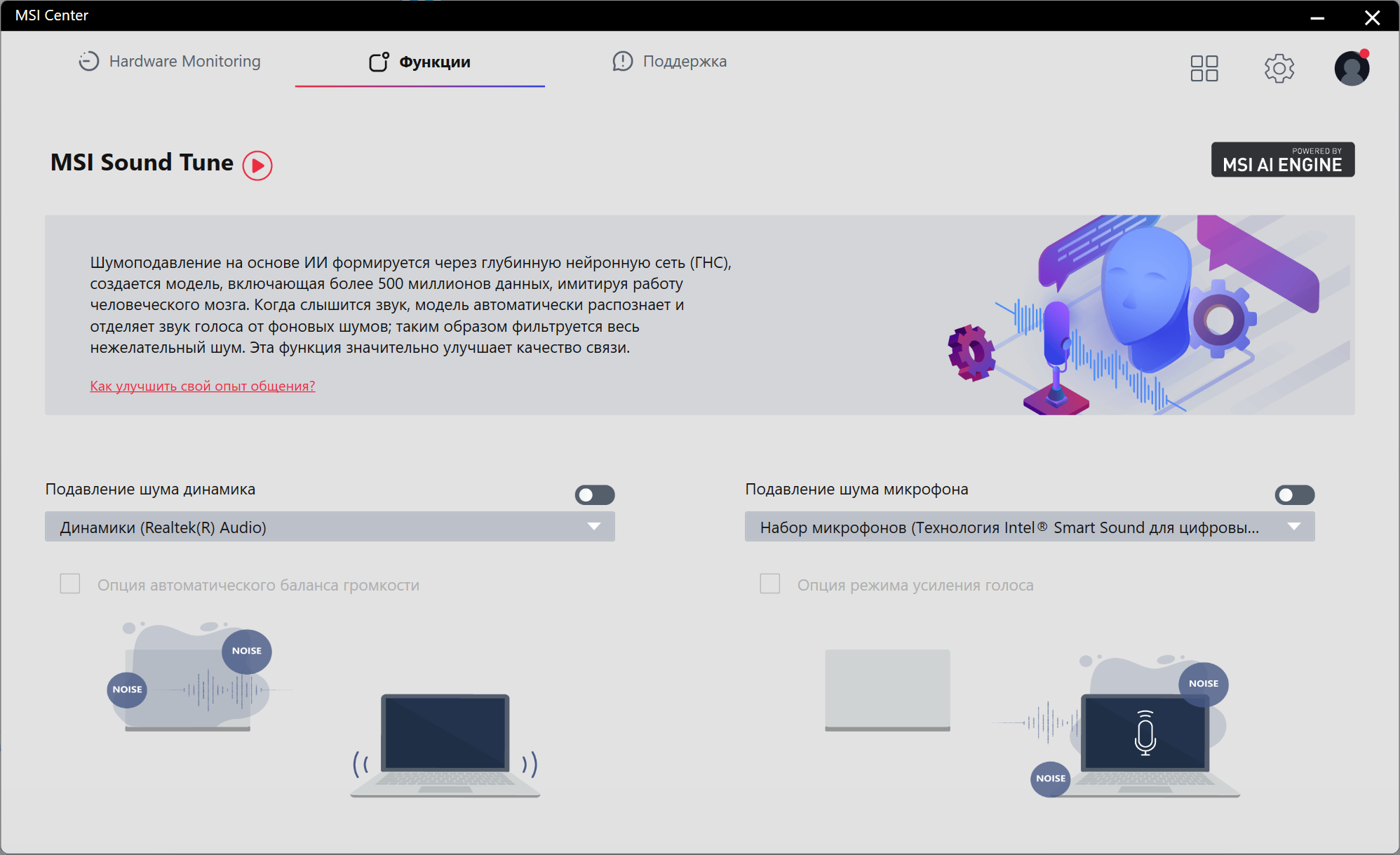 Вкладка «Функции» имеет четыре подраздела: Gaming Mode, User Scenario, General Settings и Noise Cancellation.