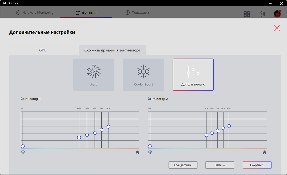 Для сценария «Экстремальная производительность» выбираются профили работы вентиляторов, есть возможность разгона GPU и видеопамяти по частоте на величину до 200 МГц.