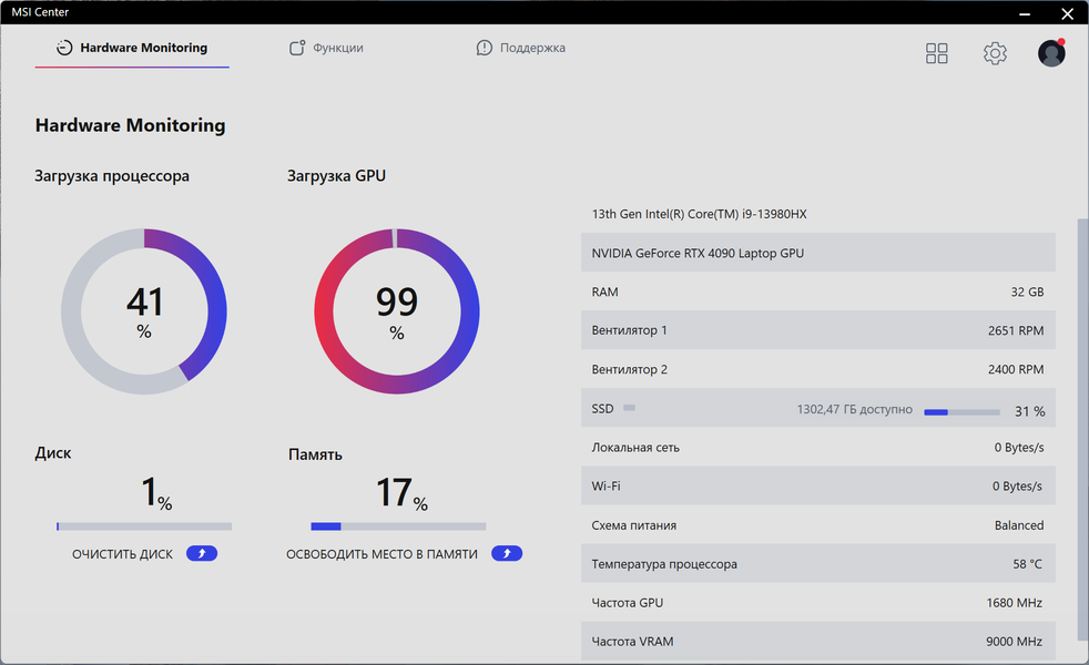 Быстро переключаться между сценариями можно и без запуска утилиты нажатием Fn+F7. А для включения-выключения режима Cooler Boost предусмотрено сочетание Fn+↑ (при включении оба вентилятора разгоняются до 6200-6300 оборотов в минуту, шум получается соответствующий).
