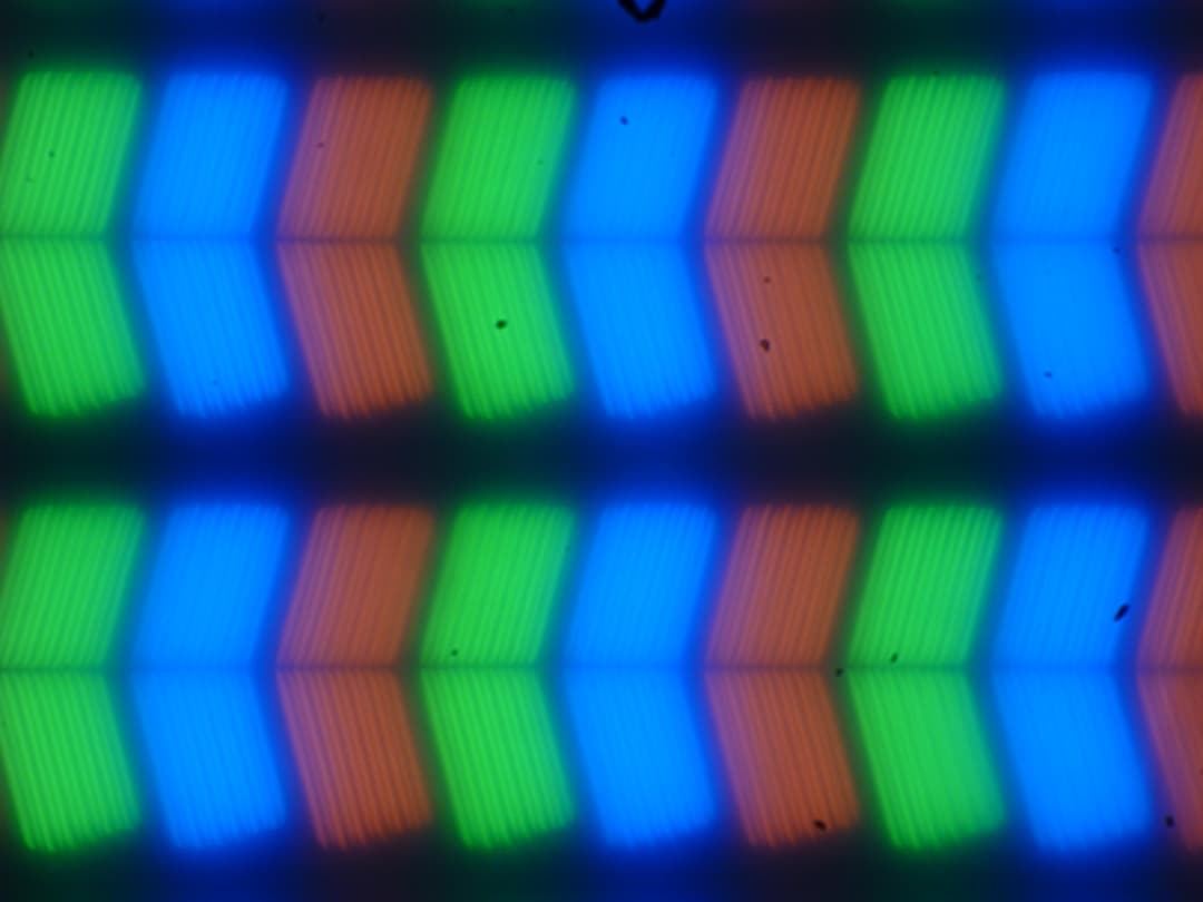 В этом ноутбуке используется матрица типа IPS. Микрофотографии демонстрируют типичную для IPS структуру субпикселей (черные точки — это пыль на матрице фотоаппарата):