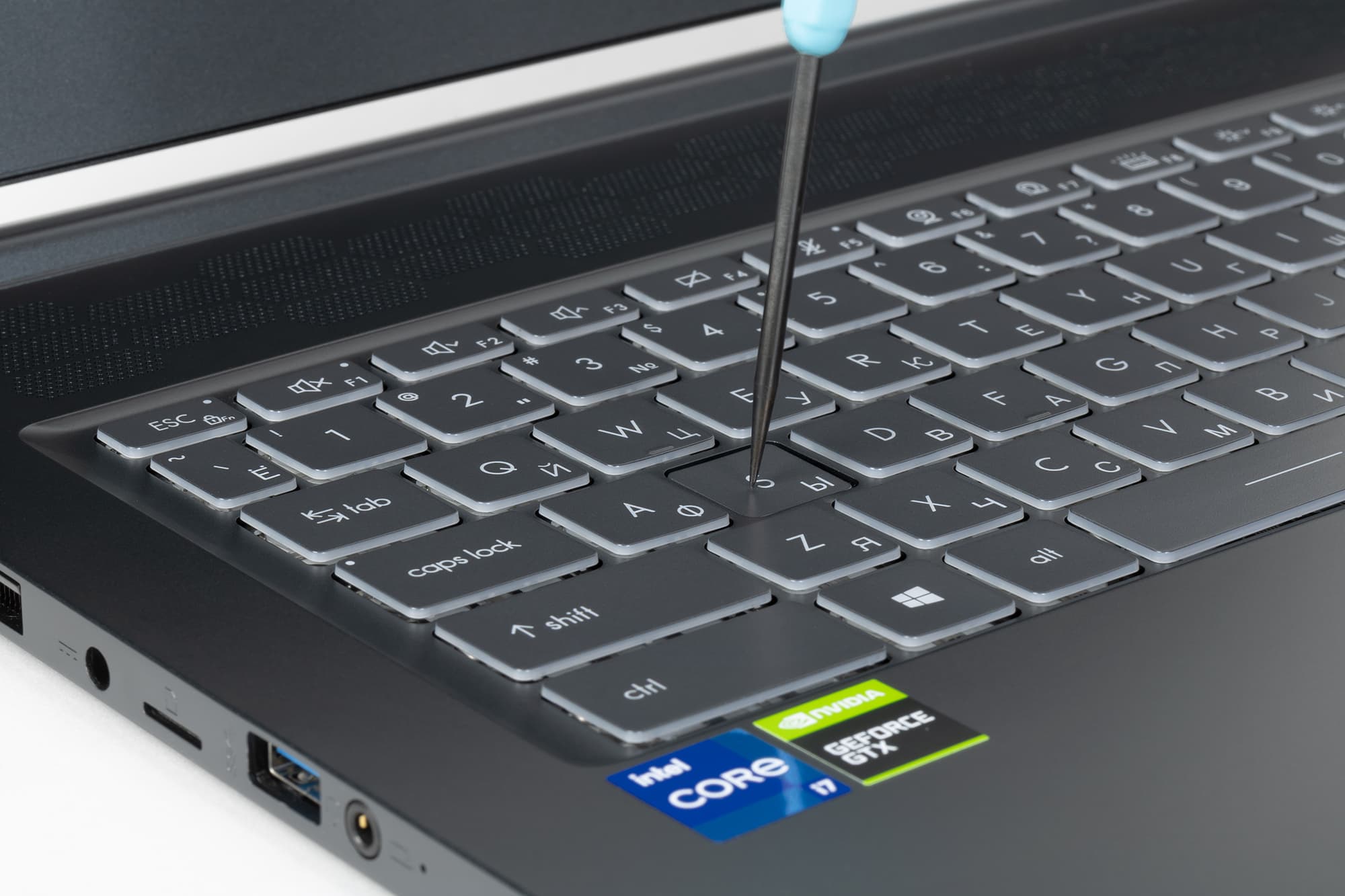 В традиционном месте перед клавиатурой расположен заглубленный кликпад размером 105×66 мм. У него нет выделенных клавиш, но сенсорная площадка поддерживает нажатия условно в левом нижнем и правом нижнем углах, что соответствует нажатиям стандартных кнопок мышки. Авторы обзора не являются любителями кликпадов, по условным кнопкам не всегда удается попасть с первого раза, а сложные операции, типа выделения и перетаскивания, здесь осуществлять совсем неудобно. У нас были регулярные трудности даже с касанием двумя пальцами для вызова контекстного меню — курсор при этом постоянно сильно сдвигался. Разумеется, поддерживаются все традиционные жесты, например для переключения рабочих столов, сворачивания и разворачивания окон, которые осуществляются двумя, тремя или четырьмя пальцами, но для горизонтальных четырехпальцевых жестов площадка кликпада все-таки маловата. Тачпад можно быстро отключить сочетанием клавиш. К сожалению, столь удобного в быту сканера отпечатков пальцев у ноутбука нет — видимо, это не геймерский атрибут.