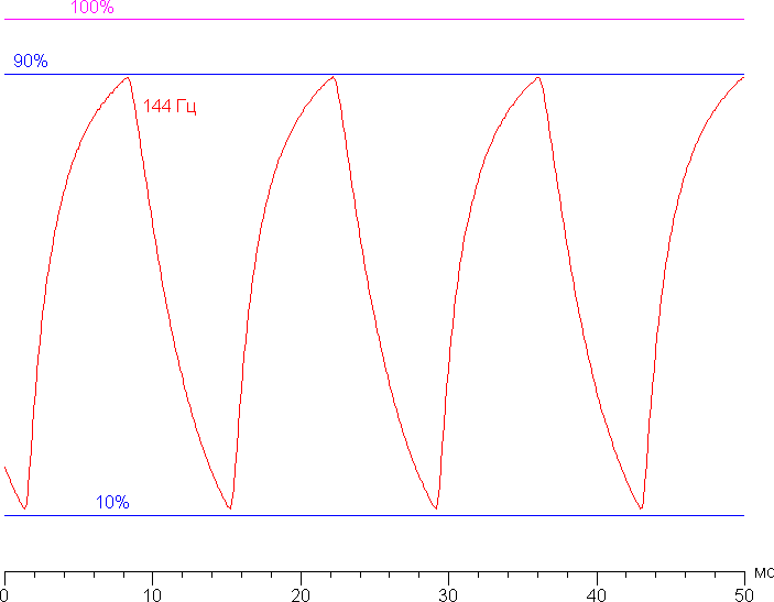 Видно, что при 144 Гц максимальная яркость белого кадра почти достигает 90% от уровня белого, а минимальная яркость черного кадра очень близка к 10%. То есть скорости матрицы практически достаточно для полноценного вывода изображения с кадровой частотой 144 Гц.