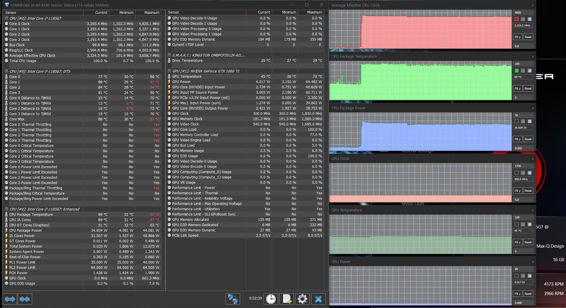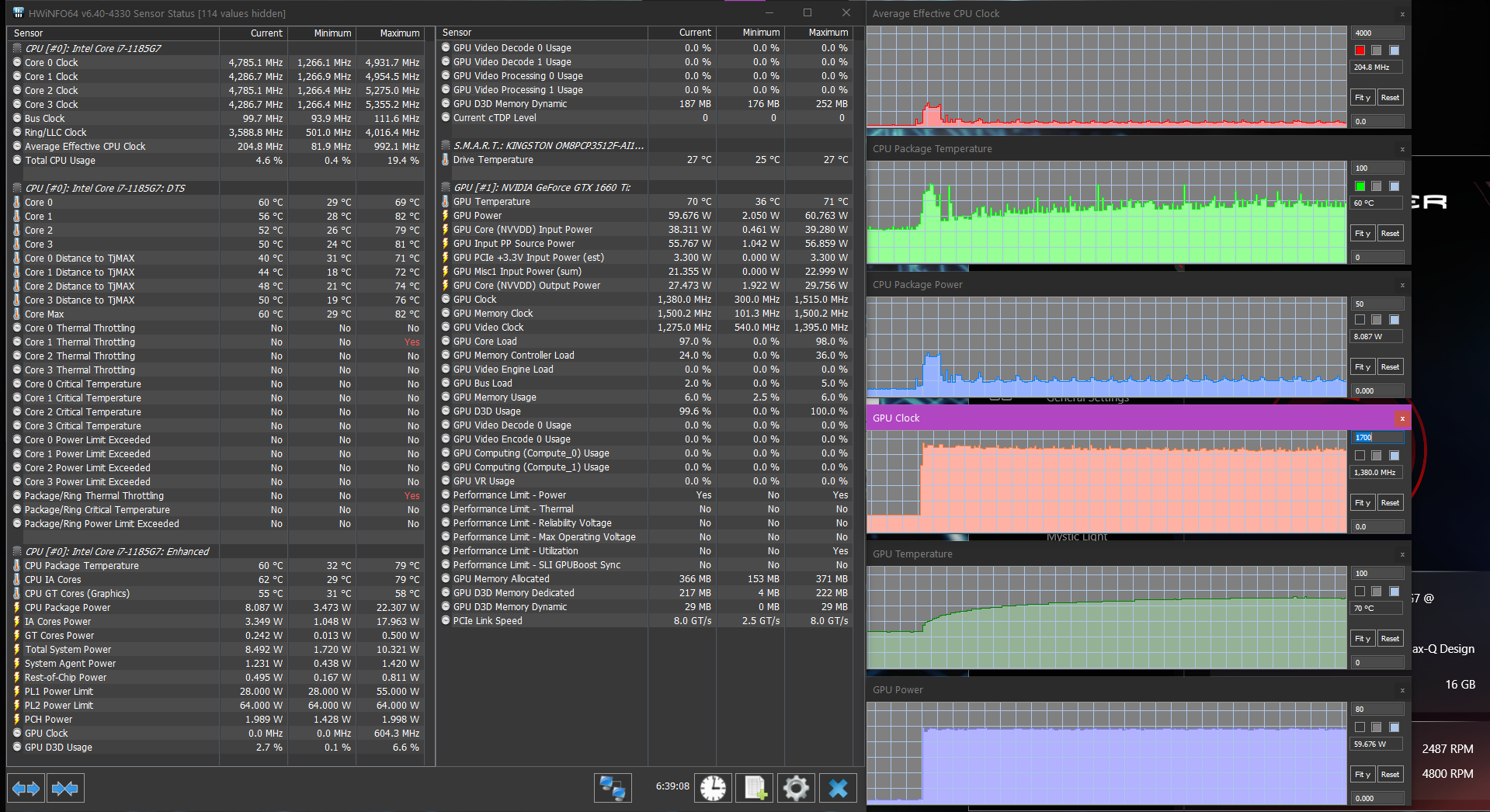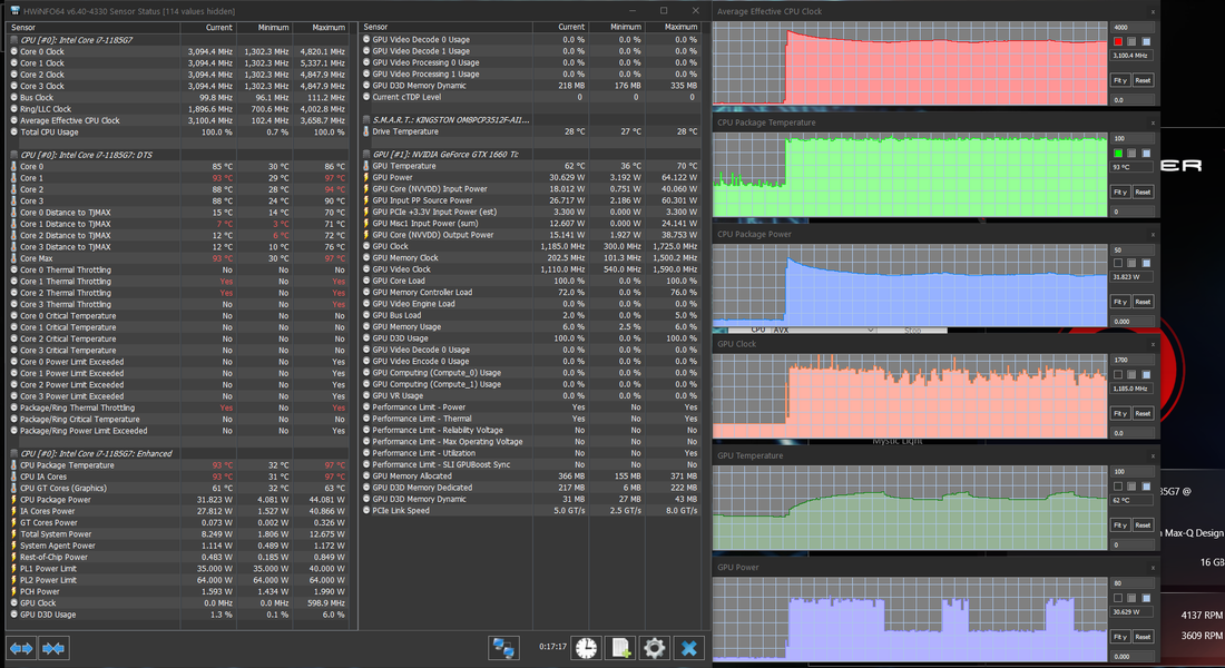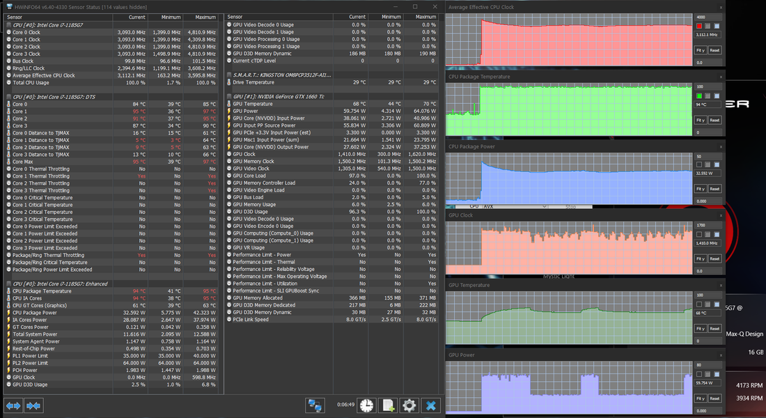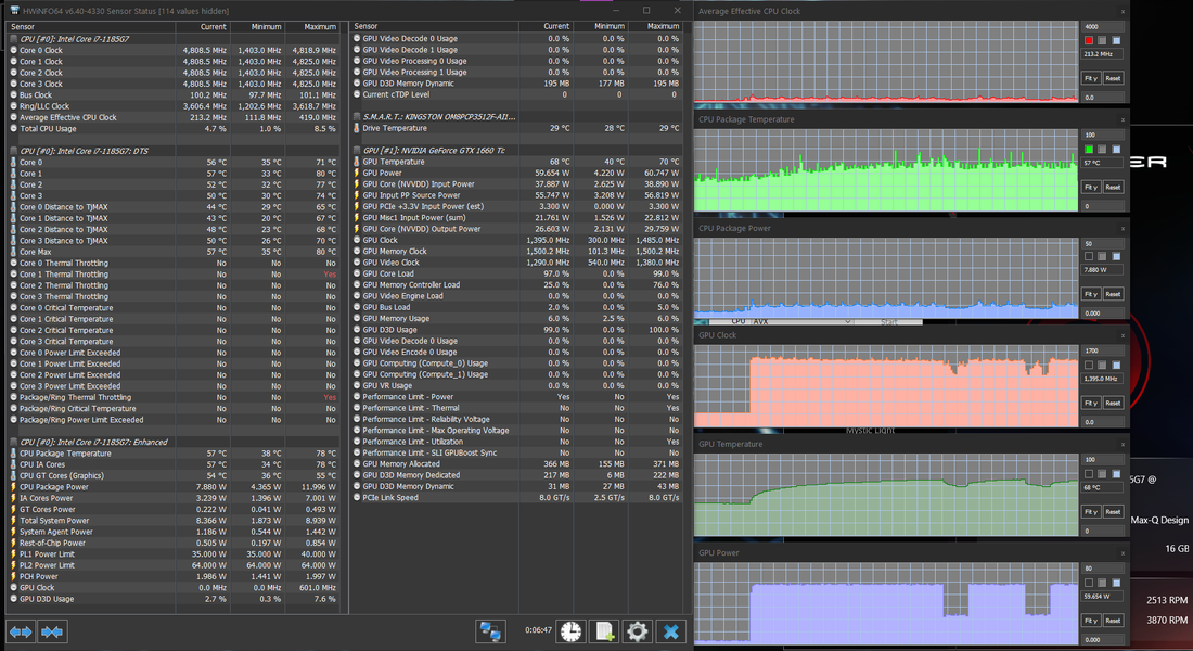 Попробовать в играх новую «ириску» (интегрированную графику Iris Xe процессора Core i7-1185G7) было интересно, но для начала поговорим все-таки об актуальном для покупателя этого ноутбука. А он, без сомнения, будет пользоваться дискретной игровой видеокартой среднего уровня Nvidia GeForce GTX 1660 Ti в исполнении Max-Q с 6 ГБ GDDR6. Напомним, что исполнение Max-Q подразумевает некоторое ухудшение характеристик карты ради заметного снижения энергопотребления (в данном случае — с 80 до 60 Вт). Низкоуровневые параметры этого ускорителя представлены на скриншоте, мы же по итогам тестирования можем подтвердить, что в производительных режимах работы ноутбука и системы охлаждения он штатно работал при потреблении 60 Вт — почти всегда, а про исключения поговорим отдельно.