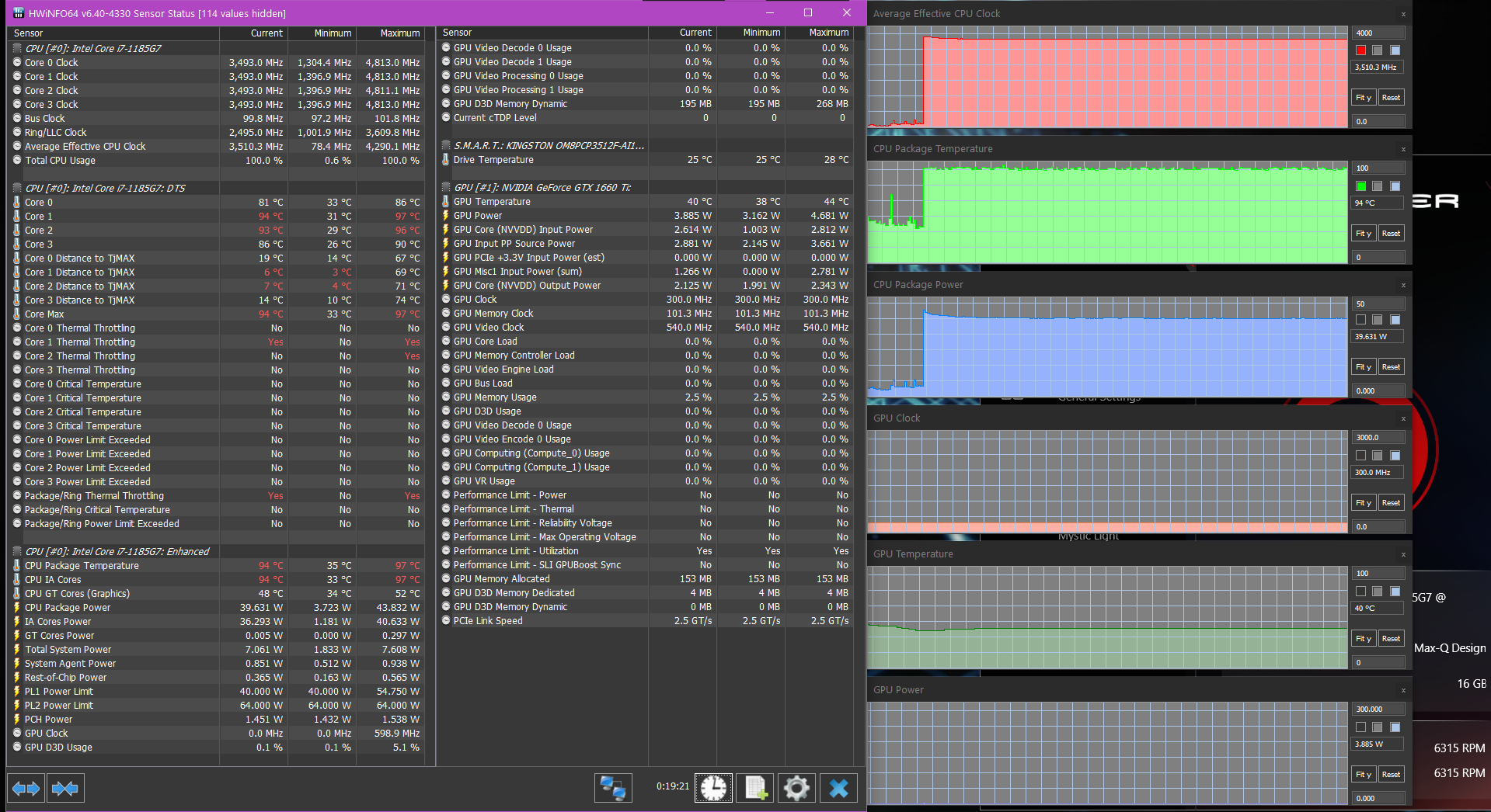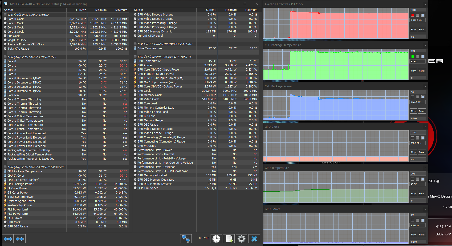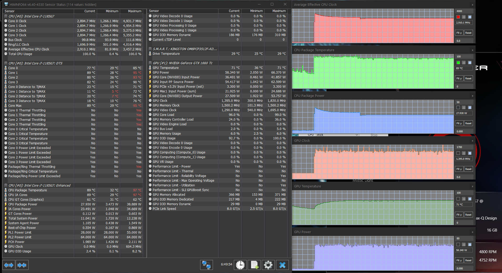 Попробовать в играх новую «ириску» (интегрированную графику Iris Xe процессора Core i7-1185G7) было интересно, но для начала поговорим все-таки об актуальном для покупателя этого ноутбука. А он, без сомнения, будет пользоваться дискретной игровой видеокартой среднего уровня Nvidia GeForce GTX 1660 Ti в исполнении Max-Q с 6 ГБ GDDR6. Напомним, что исполнение Max-Q подразумевает некоторое ухудшение характеристик карты ради заметного снижения энергопотребления (в данном случае — с 80 до 60 Вт). Низкоуровневые параметры этого ускорителя представлены на скриншоте, мы же по итогам тестирования можем подтвердить, что в производительных режимах работы ноутбука и системы охлаждения он штатно работал при потреблении 60 Вт — почти всегда, а про исключения поговорим отдельно.