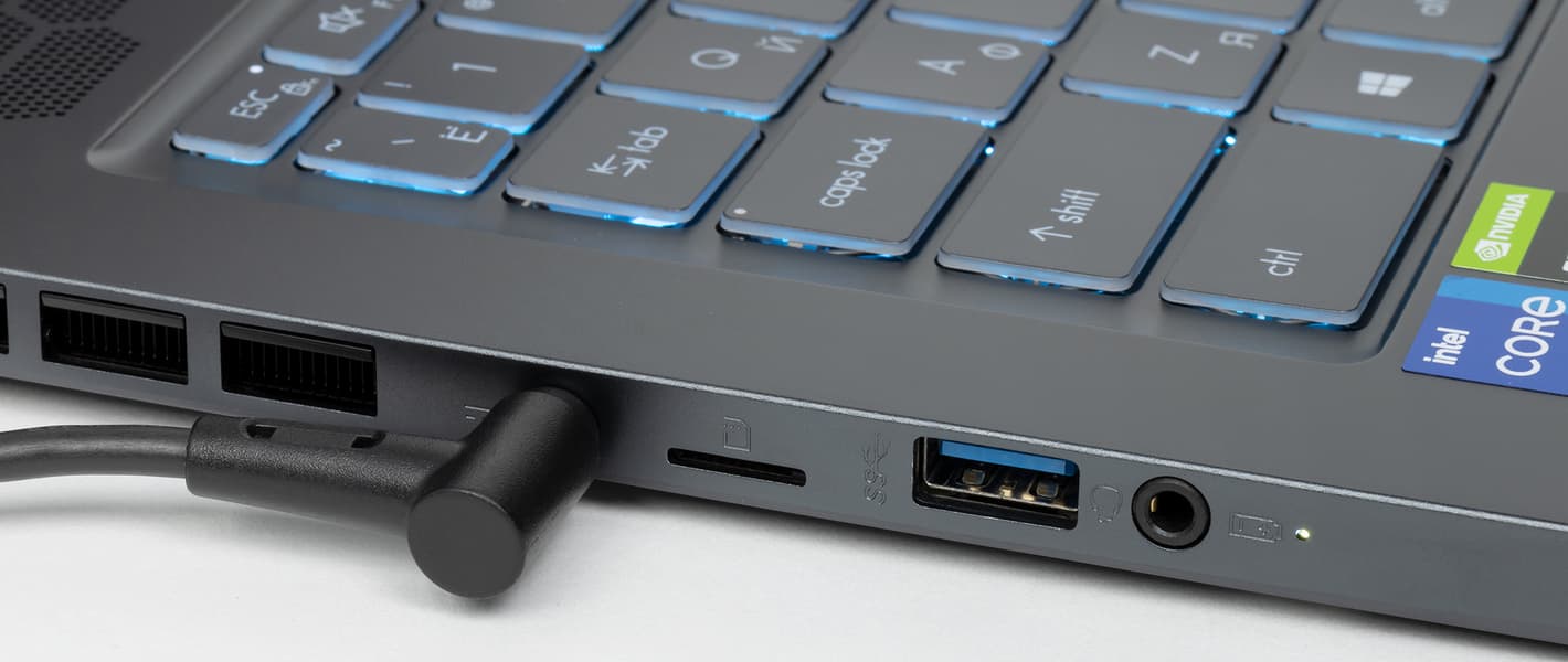 Это первый ноутбук с портом Thunderbolt 4, который мы тестируем, и расширенные возможности этого порта, конечно, радуют, но в целом портов USB маловато. На текущий момент Thunderbolt 4 как таковой обычному пользователю практически бесполезен, но перспективы его использования очень радужные. Одна возможность вывода на монитор/телевизор картинки с разрешением 8K простым и удобным кабелем чего стоит, да и скорость передачи данных 40 Гбит/с лишней не будет — найти бы еще устройство, способное ее развить!