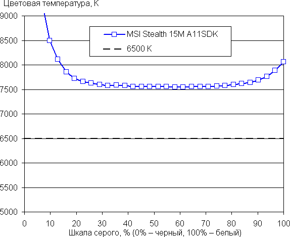 Баланс оттенков на шкале серого приемлемый, так как цветовая температура не сильно выше стандартных 6500 К, и отклонение от спектра абсолютно черного тела (ΔE) ниже 10, что для потребительского устройства считается хорошим показателем. При этом цветовая температура и ΔE мало изменяются от оттенка к оттенку — это положительно сказывается на визуальной оценке цветового баланса. (Самые темные области шкалы серого можно не учитывать, так как там баланс цветов не имеет большого значения, да и погрешность измерений цветовых характеристик на низкой яркости большая.)