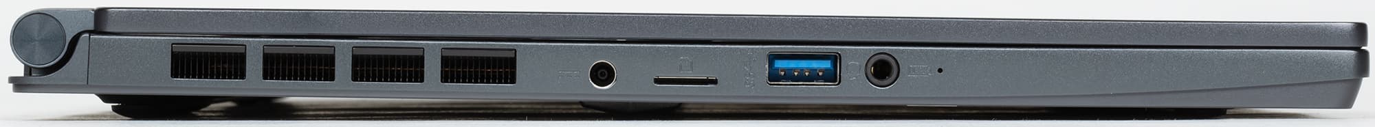 Интерфейсные порты у ноутбука расположены только по бокам. Из-за малой высоты боковин разъем проводной сети туда не уместился, придется использовать быстрый беспроводной адаптер Wi-Fi 6.