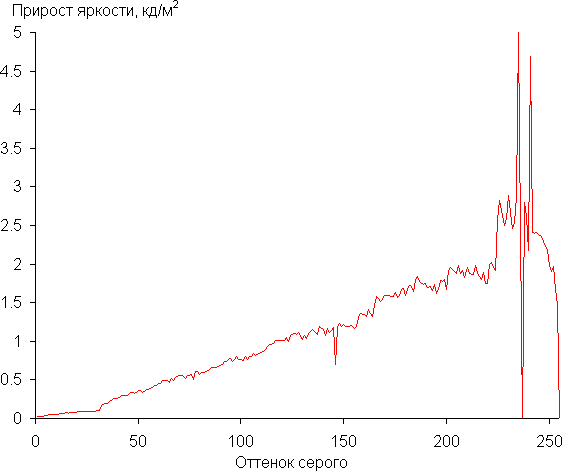 Далее мы измерили яркость 256 оттенков серого (от 0, 0, 0 до 255, 255, 255) при настройках по умолчанию. График ниже показывает прирост (не абсолютное значение!) яркости между соседними полутонами: