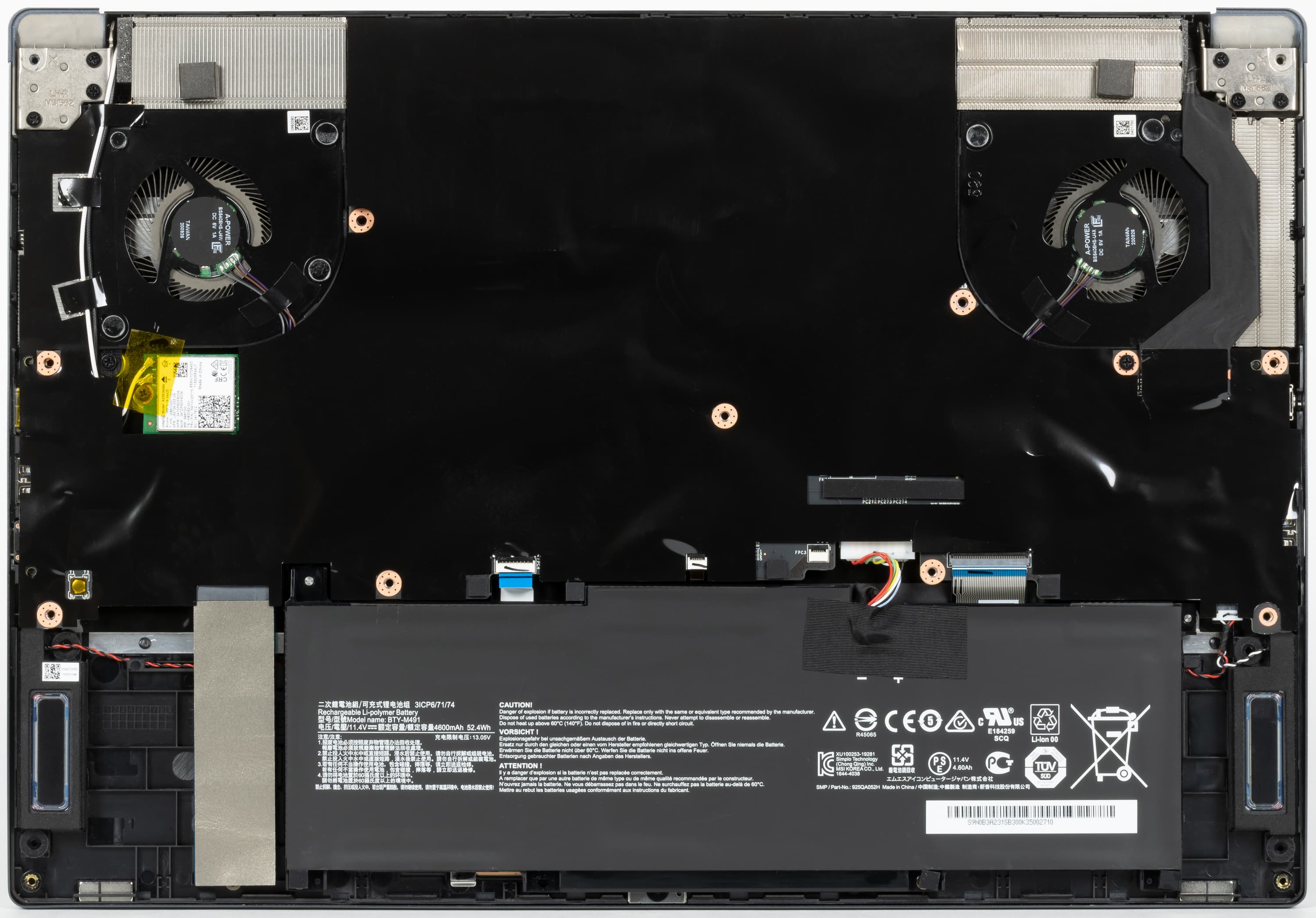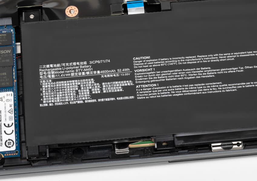 Сняв нижнюю панель корпуса, можно разглядеть кулеры, несъемную батарею, беспроводной сетевой адаптер и SSD-накопитель в слоте M.2 2280. 16 ГБ памяти DDR4-3200 в ноутбуке набраны двумя модулями в слотах SO-DIMM, модули при необходимости можно проапгрейдить самостоятельно, однако добраться до слотов будет непросто: они расположены на оборотной стороне платы. SSD-накопитель тоже можно заменить самостоятельно, но второго слота M.2 или отсека для установки диска 2,5″ не предусмотрено.