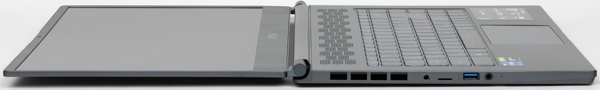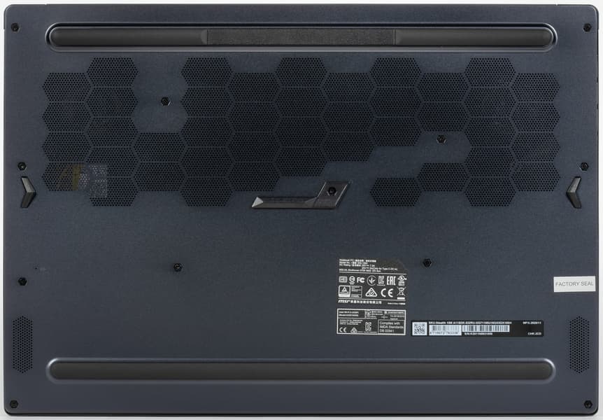 У MSI Stealth 15M алюминиевый корпус темно-серого цвета с синеватым оттенком (также есть вариант белого цвета), поверхность металла чуть шершавая, так что ноутбук и смотрится отлично, и в руках ощущается очень приятно. Правда, отпечатки пальцев на таком покрытии хорошо заметны и плохо оттираются. Внешне всё говорит о том, что это решение из категории ультрабуков: корпус тонкий (16,5 мм без учета ножек), компактный по ширине и глубине для 15-дюймовой модели, а также довольно легкий (1,67 кг). Однако не забывайте про игровую видеокарту внутри!