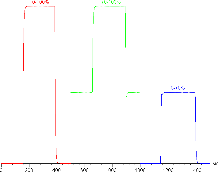 В данном случае выбросы можно увидеть при переходах 100% — 70% и 0% — 70%.
