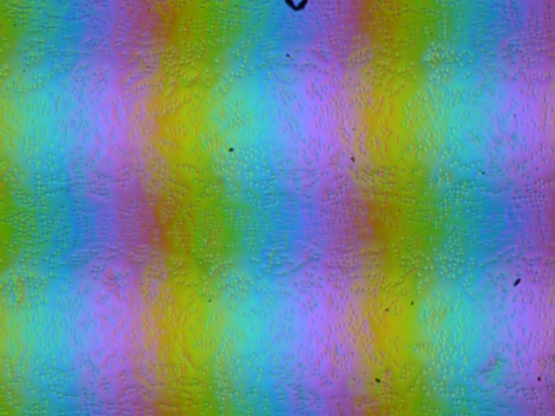 Зерно этих дефектов в несколько раз меньше размеров субпикселей (масштаб этих двух фотографий примерно одинаковый), поэтому фокусировка на микродефектах и «перескок» фокуса по субпикселям при изменении угла зрения выражены слабо, из-за этого нет и «кристаллического» эффекта.