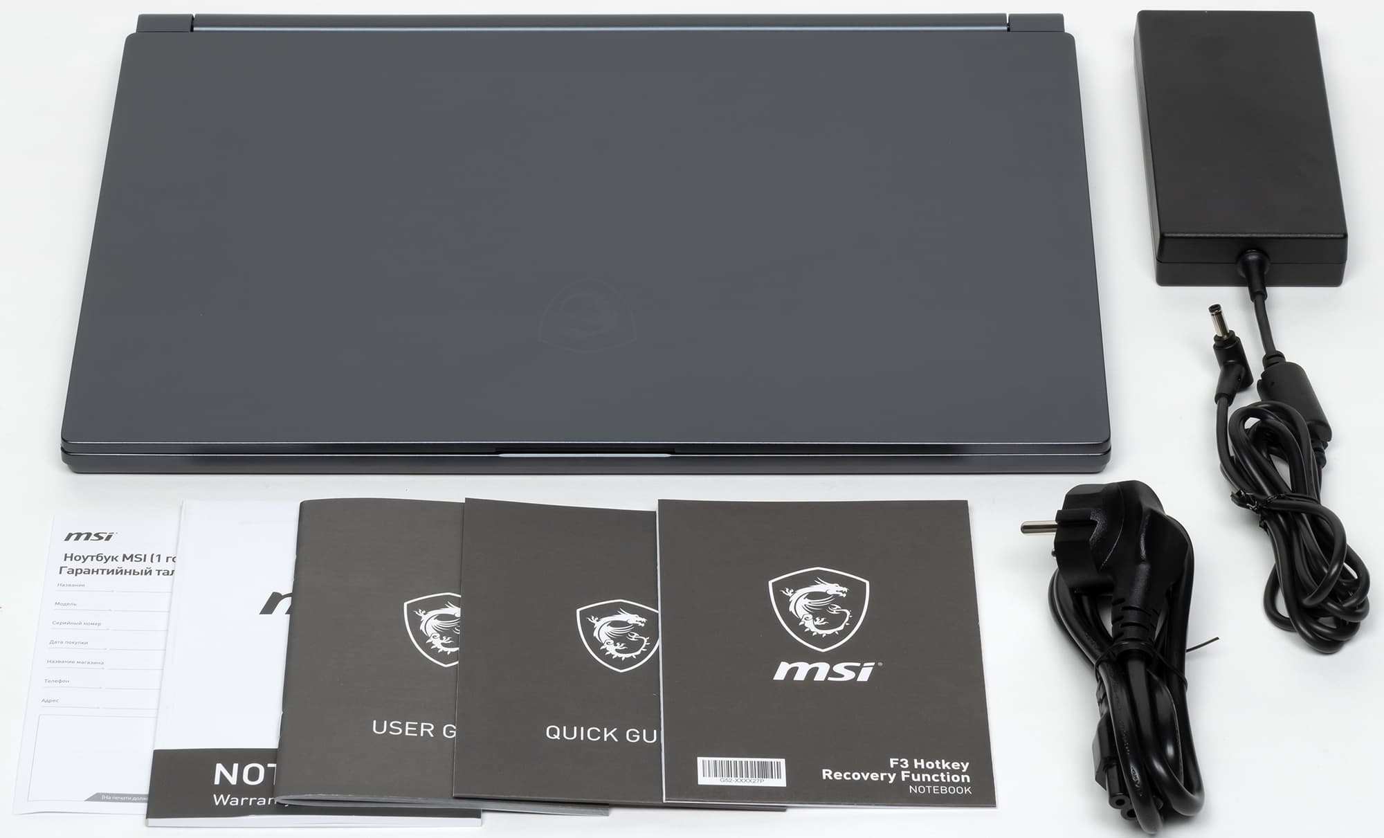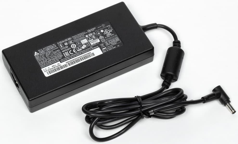 В обычной картонной коробке (без ручки для переноски) вместе с ноутбуком можно найти только адаптер питания на 150 Вт весом 350 г с суммарной длиной двух кабелей 2,8 м и печатную продукцию.