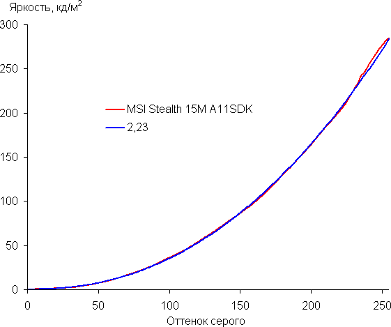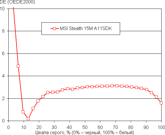 Рост прироста яркости более-менее равномерный и почти каждый следующий оттенок значимо ярче предыдущего, однако в светах равномерность роста нарушается, а один ближайший к белому оттенок по яркости от белого не отличается. В самой темной области хорошо различаются все оттенки, что для игрового ноутбука особенно актуально: