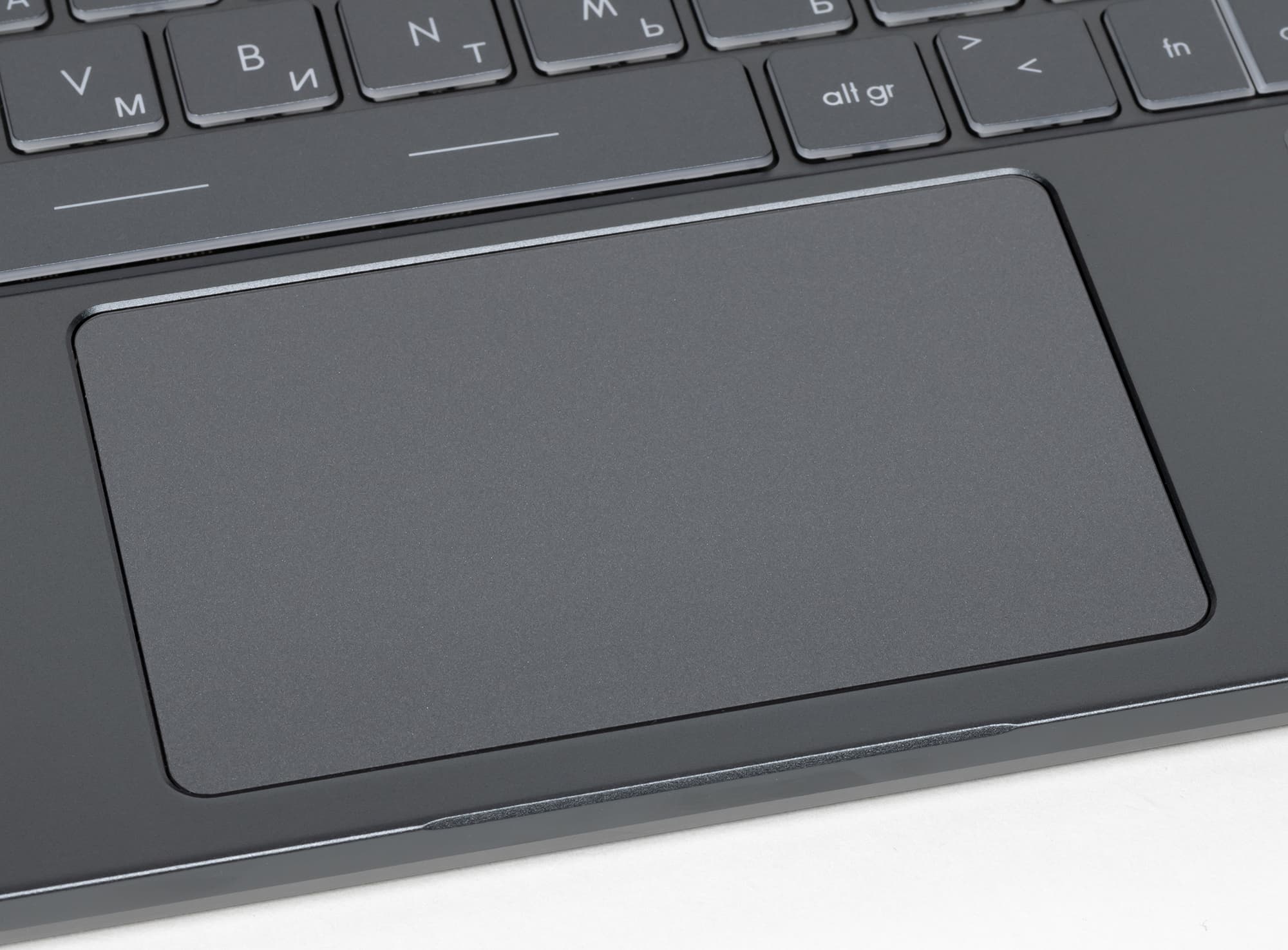 Клавиатура здесь типичная для 15-дюймовых ноутбуков, с чуть увеличенными основными клавишами (16,5×16,5 мм) и небольшим ходом мембранных кнопок (1,4 мм). Расстояние между центрами клавиш в одном ряду составляет 19,5 мм, а между их краями — 4 мм.