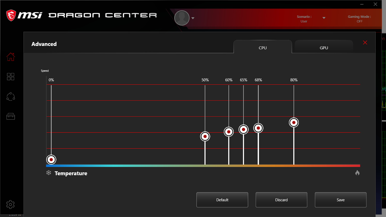 Главная фирменная утилита в данном случае называется Dragon Center, и главная ее функция — выбор сценария (как это здесь названо) работы комплектующих и системы охлаждения. Всего утилита предлагает 4 готовых сценария с очевидными названиями и, за одним исключением, без возможности настройки, а также пользовательский сценарий, в котором можно выбрать желаемый уровень производительности и профиль работы кулеров. В частности, только в пользовательском сценарии и в сценарии максимальной производительности можно выбрать максимальный режим работы кулеров — Cooler Boost. Впрочем, шум от него настолько высокий, что вряд ли кто-то захочет выбрать его в качестве долговременного. Также только в пользовательском сценарии можно выбрать и настроить продвинутый режим работы кулеров: задать кривую скорости вращения вентилятора (отдельно для кулеров CPU и GPU) по шести точкам с условной степенью нагрева. При выборе уровня производительности Turbo для пользовательского сценария можно дополнительно разогнать видеокарту (до +180 МГц частоты ядра и до +500 МГц частоты памяти), для сценария Extreme Performance это стандартная настройка. Подробнее о штатных сценариях мы поговорим в разделе тестирования под нагрузкой. Быстро переключать сценарии можно без запуска утилиты, перебор осуществляется по нажатию Fn+F7, с наглядной индикацией, это удобно.