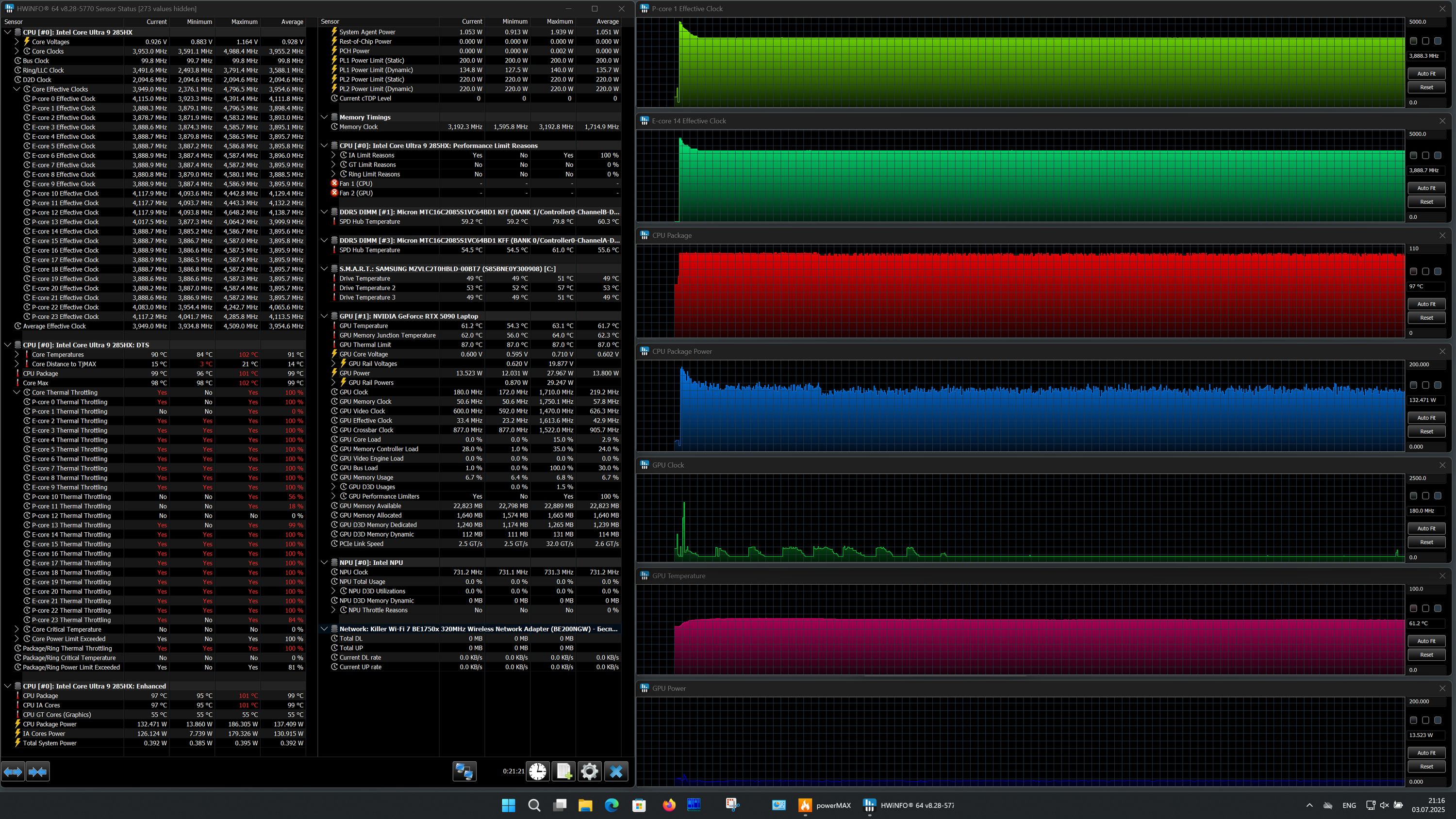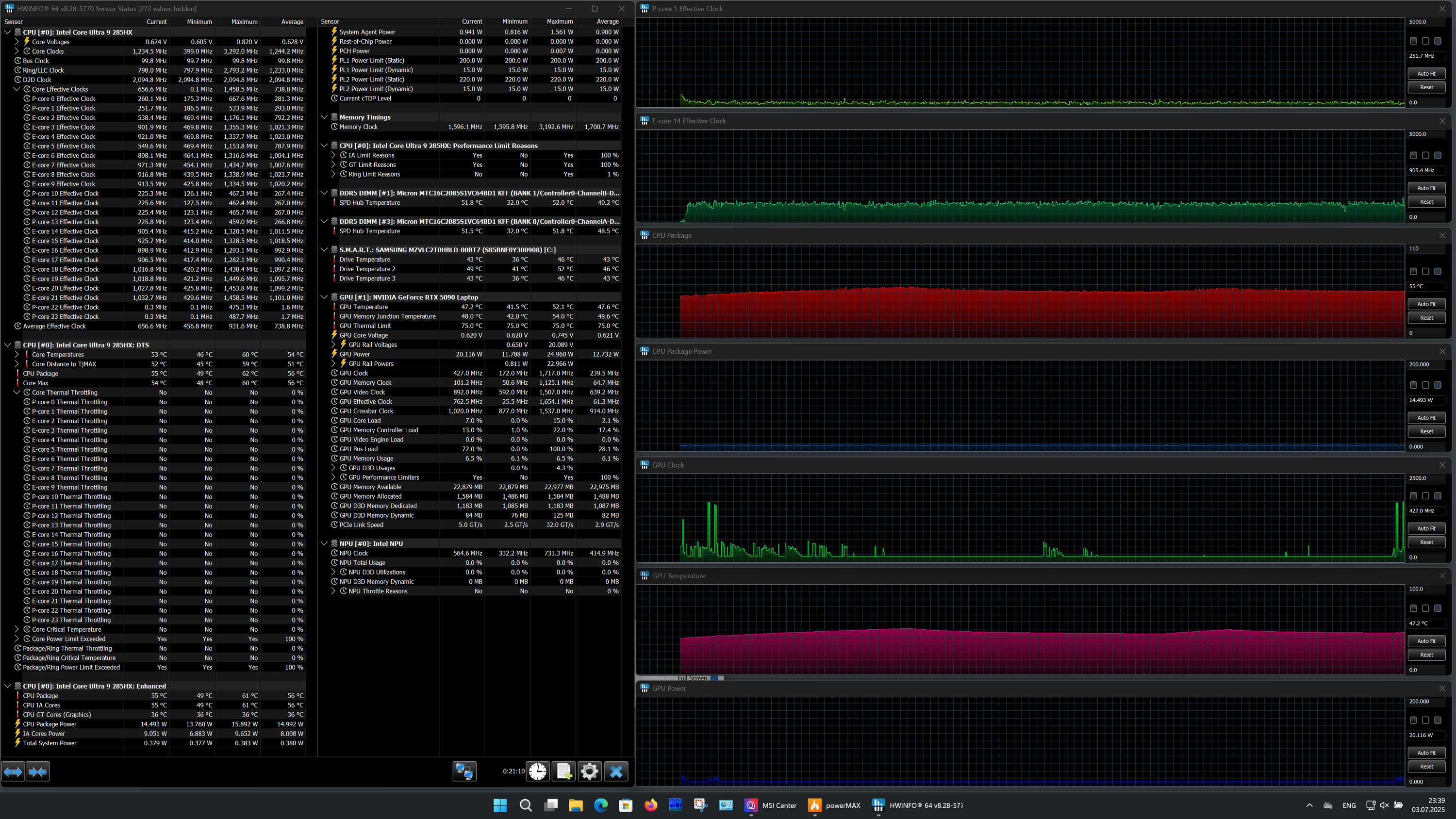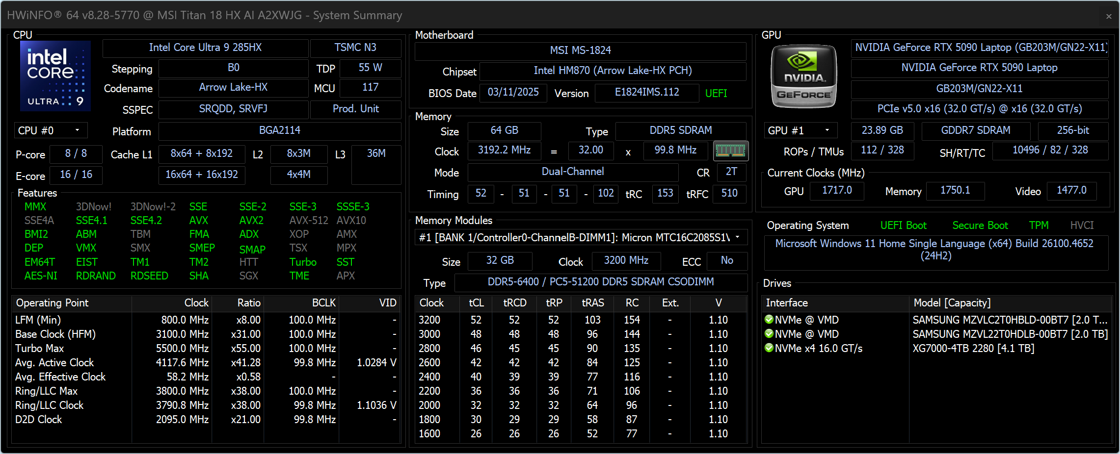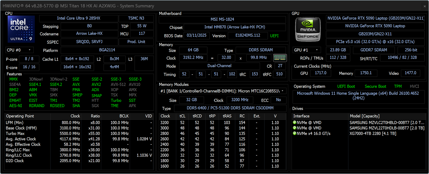 | Процессор | Intel Core Ultra 9 285HX: 8 P-ядер/8 потоков, 2,8 ГГц (Turbo 5,5 ГГц), 16 E-ядер/16 потоков; 2,1 ГГц (Turbo 4,6 ГГц); TDP 45—55 Вт (Turbo 160 Вт), Tjmax 105 °C; NPU AI Boost (13 TOPS) | |