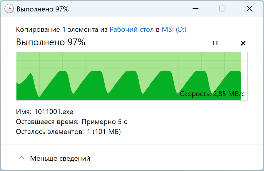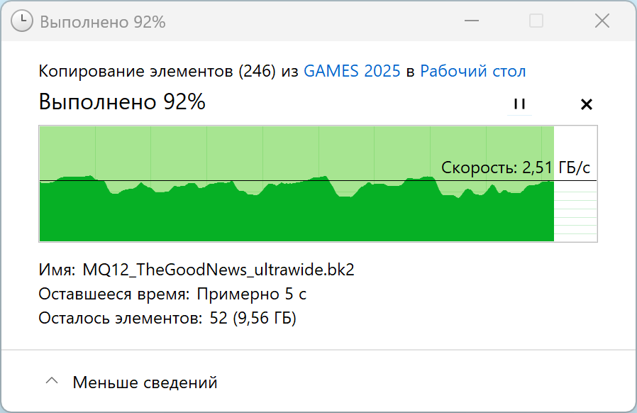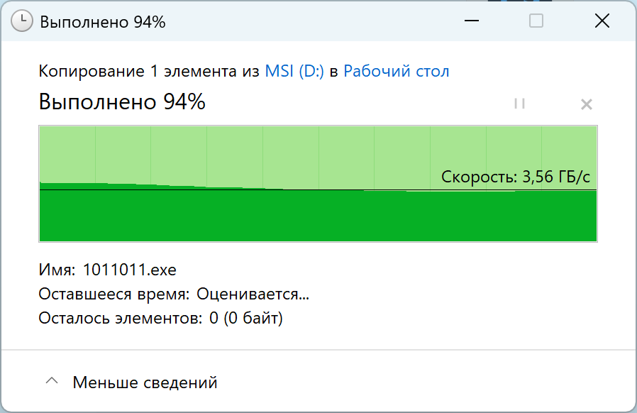 Копирование в обратном направлении происходит настолько быстро, что нам едва удалось сделать скриншот. Здесь никаких претензий нет. Правда, файл не превышал 4 ГБ, и скорее всего, Windows буферизовала копирование.