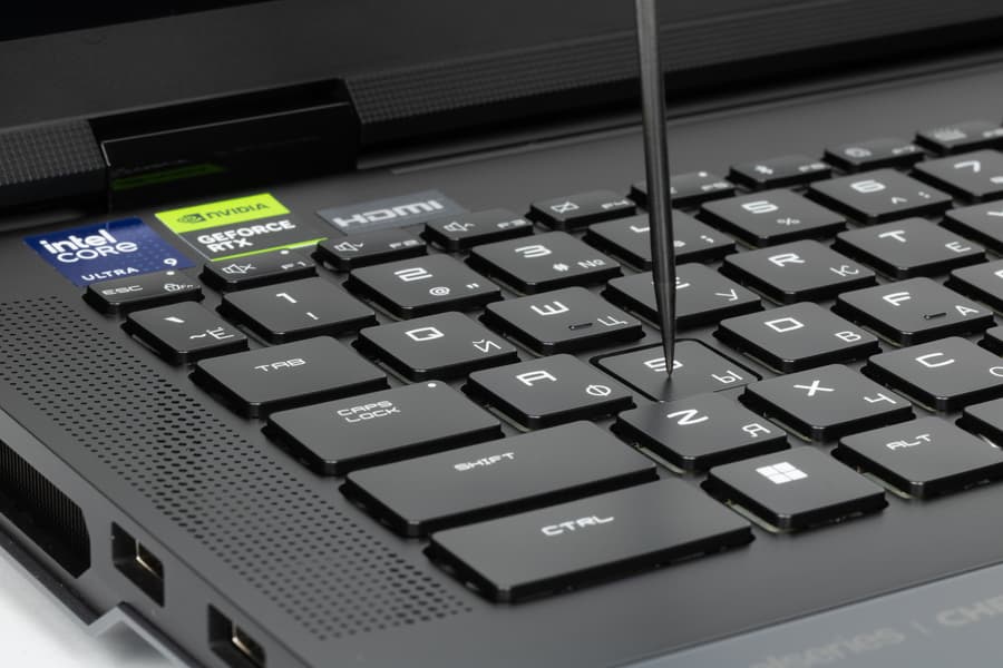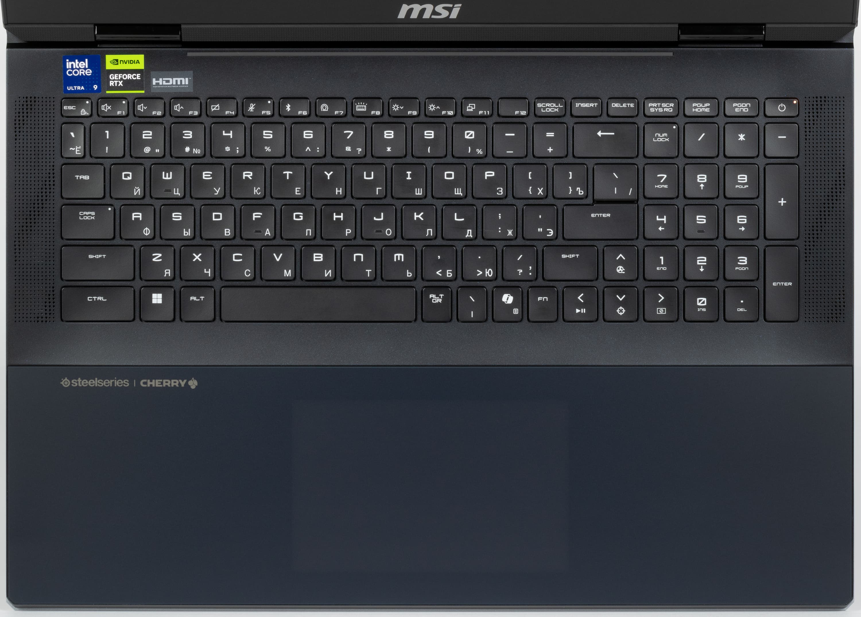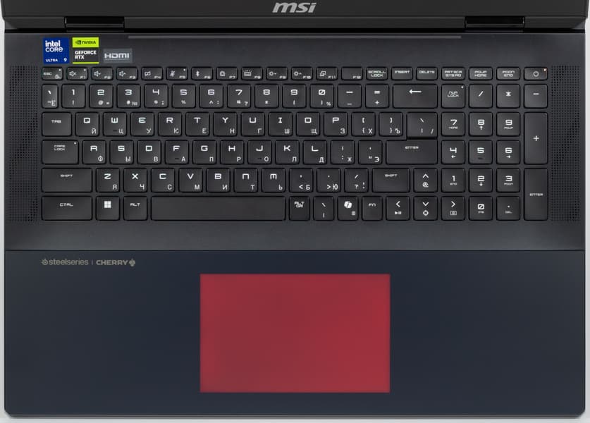 Ноутбуки MSI Titan с начала 2024 г. оснащаются не мембранными, а механическими клавиатурами, клавиши которых снабжены фирменными низкопрофильными переключателями Cherry MX Ultra-Low Profile c металлическими коромыслами и пружинами. Такая конструкция знакома по предыдущей модели MSI Titan, которая участвует в ряде состязаний в нашем обзоре.