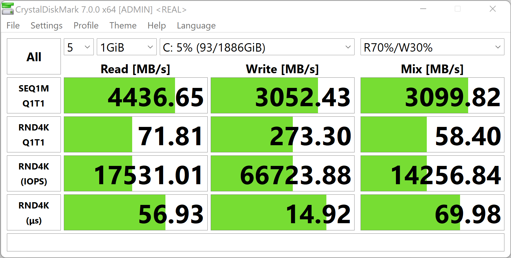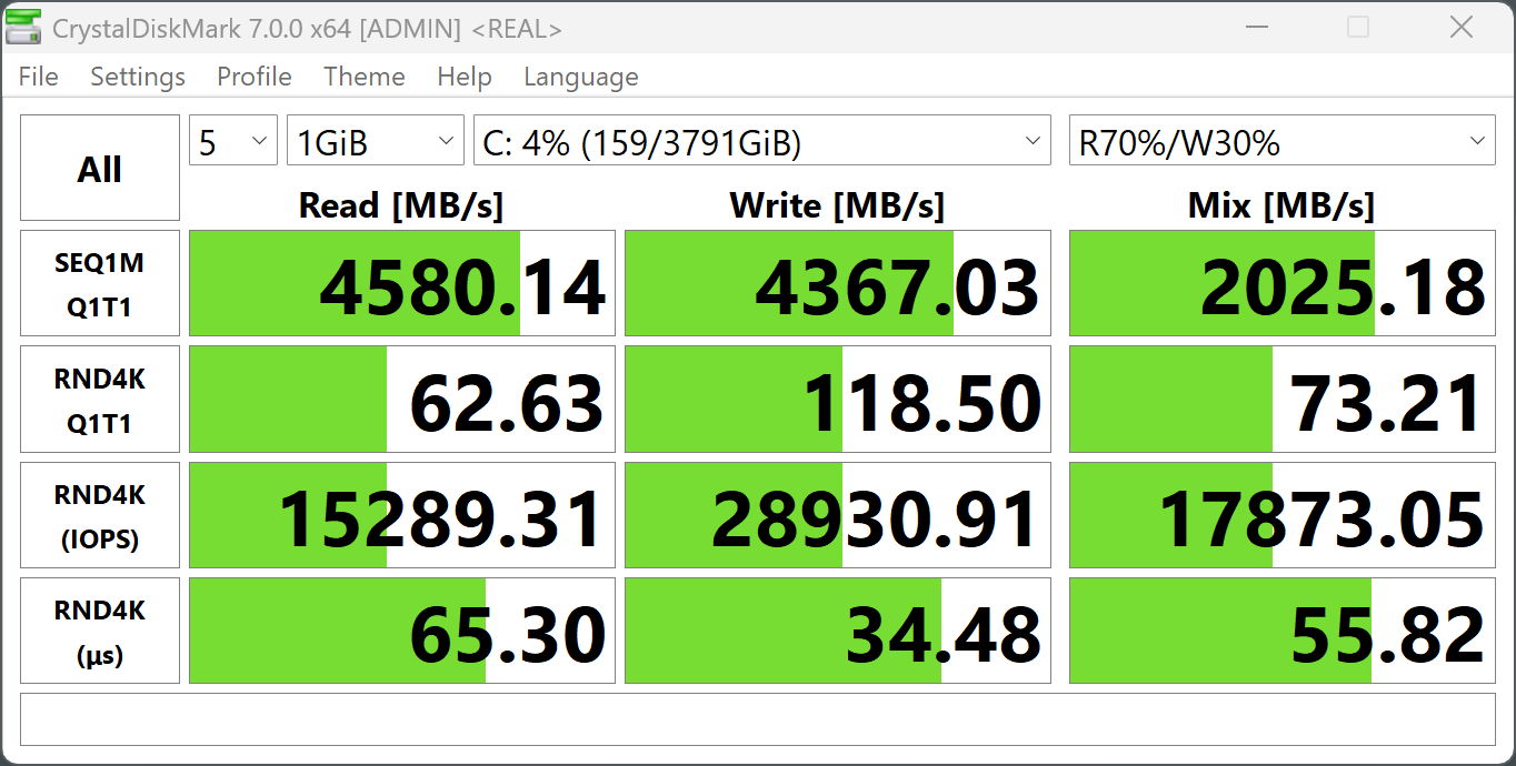 | Накопители | 2 ×2 ТБ Samsung PM9A1a (MZVLC2T0HBLD) в RAID0, в слотах M.2 (PCIe 4 ×4 и PCIe 5 ×4) можно установить еще два накопителя в слоты M.2 (PCIe 4 ×4) | |