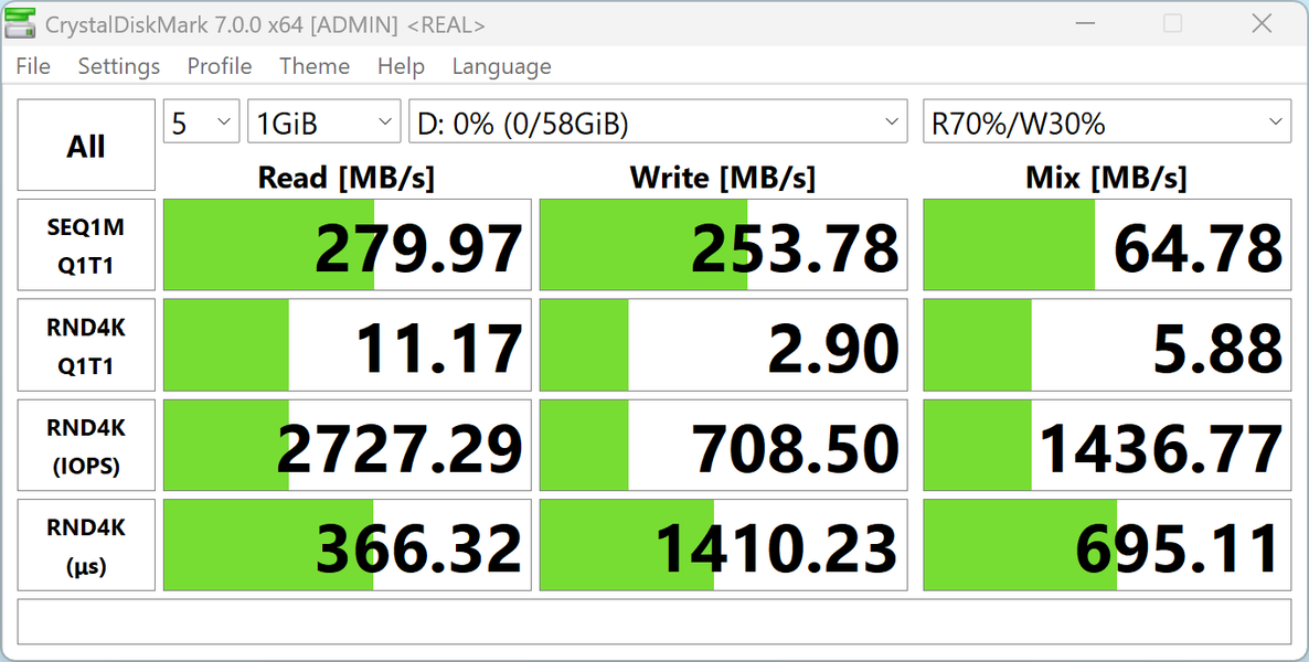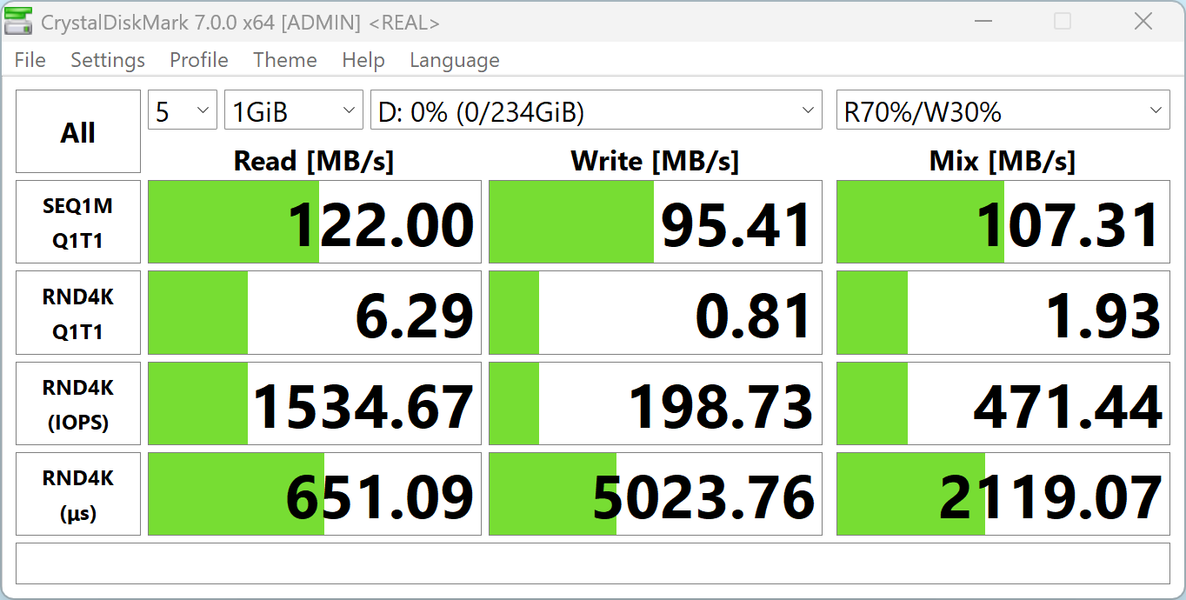 Третий бонусный аксессуар — флеш-накопитель вместимостью 256 ГБ (после разметки носителя доступно 235 ГБ). Для подключения к ПК можно использовать один из двух портов, Type-С и Type-A. Согласно производителю, устройство поддерживает скорости USB 3.2 Gen2. Поскольку дело недолгое, мы проверили эти сведения при помощи популярной утилиты CrystalDiskMark 7.