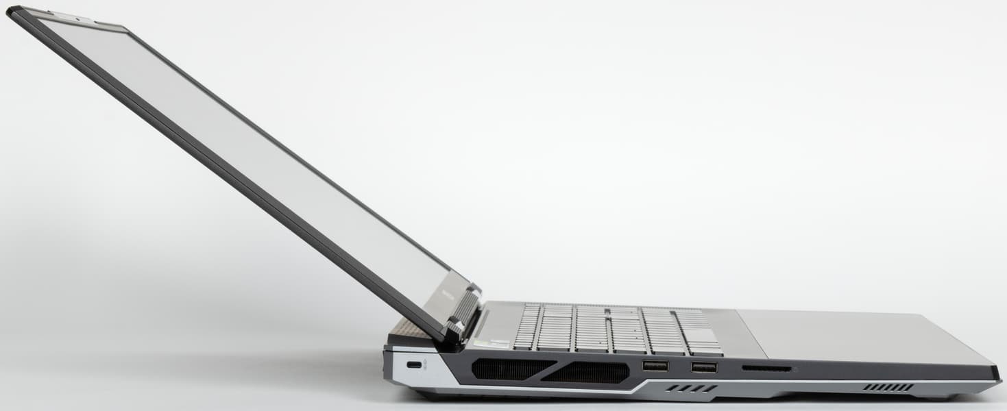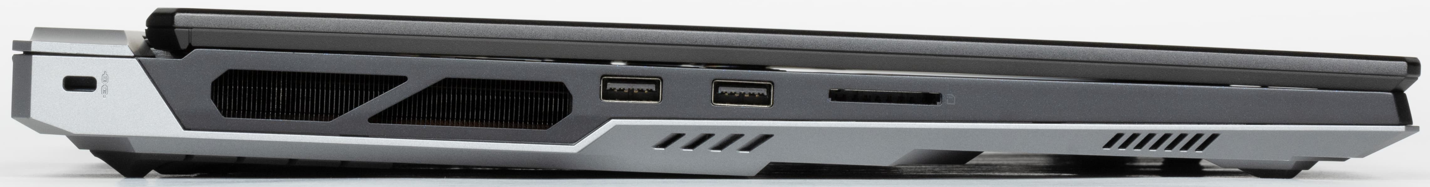На левой боковой панели имеется кенсингтонский замок, еще одна решетка выходного отверстия системы охлаждения, два порта USB 3.2 Gen2 и слот картовода для SD/SDHC/SDXC.