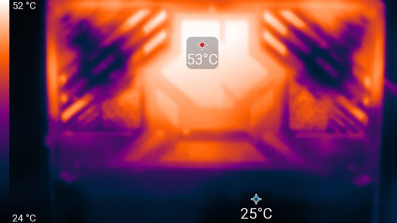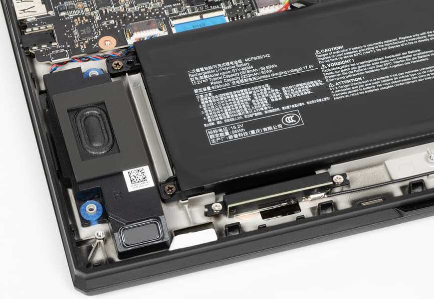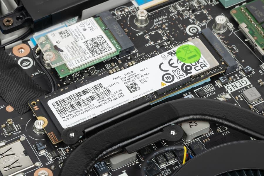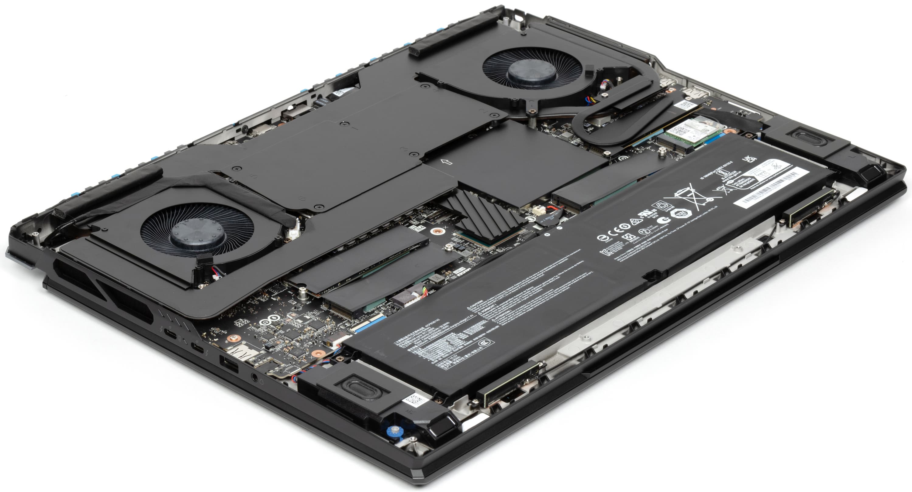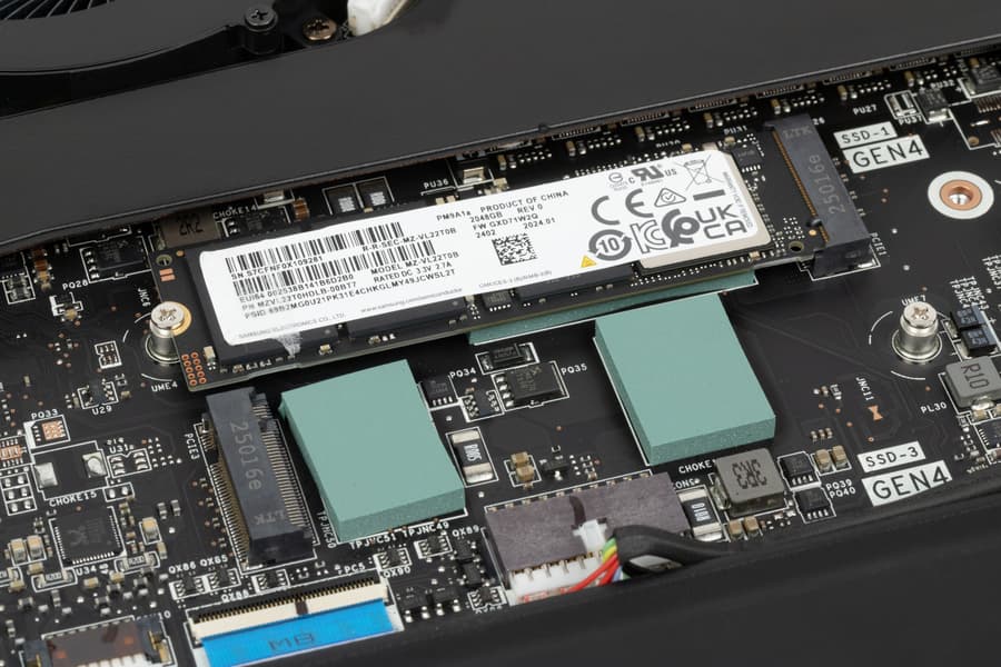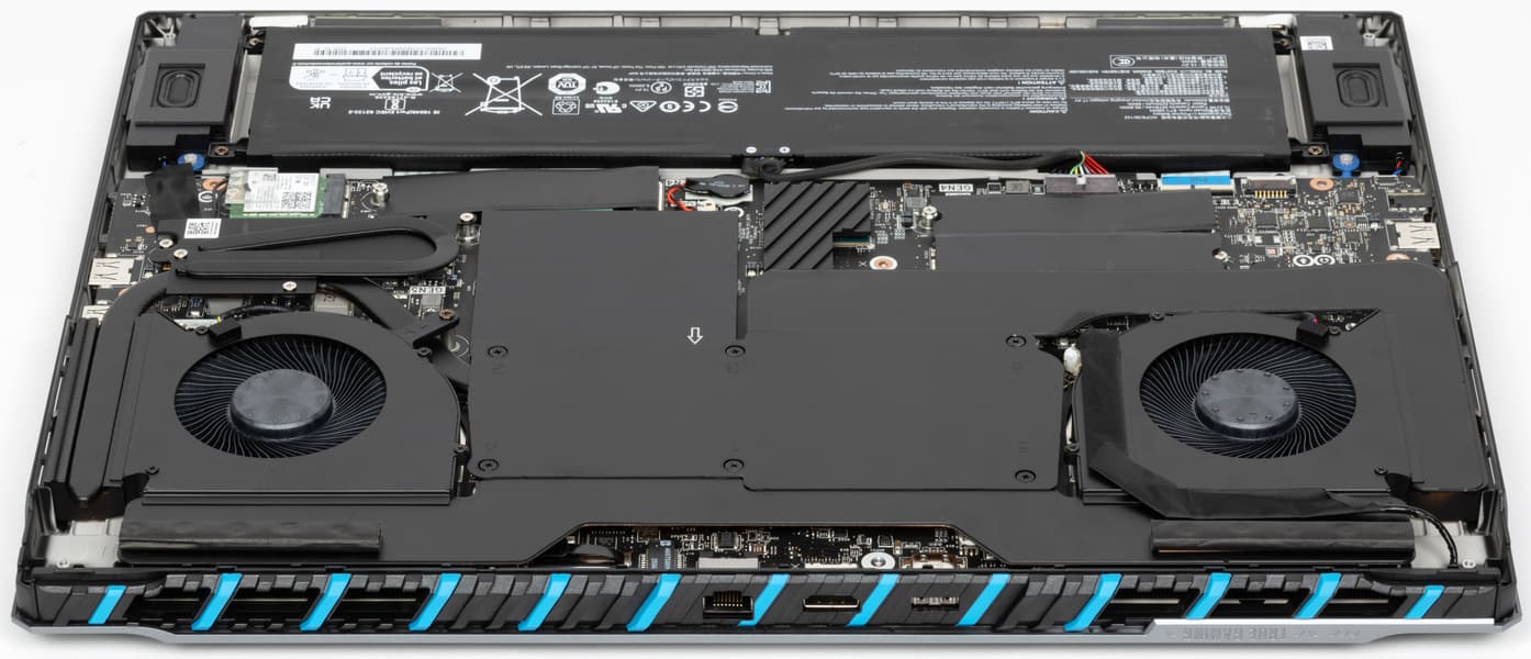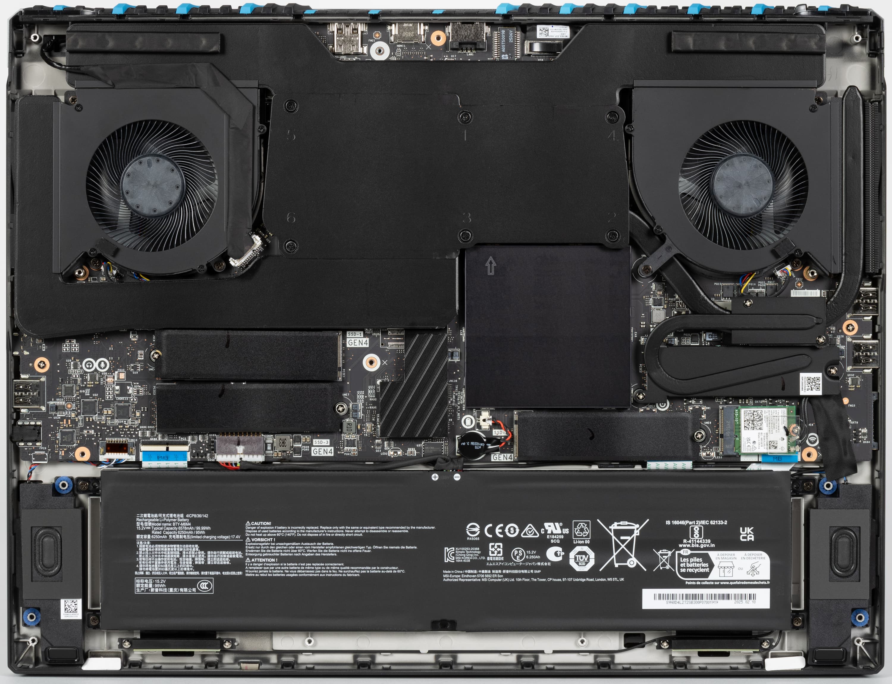 Система охлаждения (СО) надежно закрыта от взора. Без разборки (каковую мы не решись проводить) видна только пара вентиляторов, терминальная часть тепловой трубки, ведущей к левому радиатору, и отдельная тепловая трубка с теплосъемной пластиной для NVMe, установленного в слоте M.2 с интерфейсом PCIe Gen5 (вероятно, из-за более значительного тепловыделения, чем у PCIe Gen4).