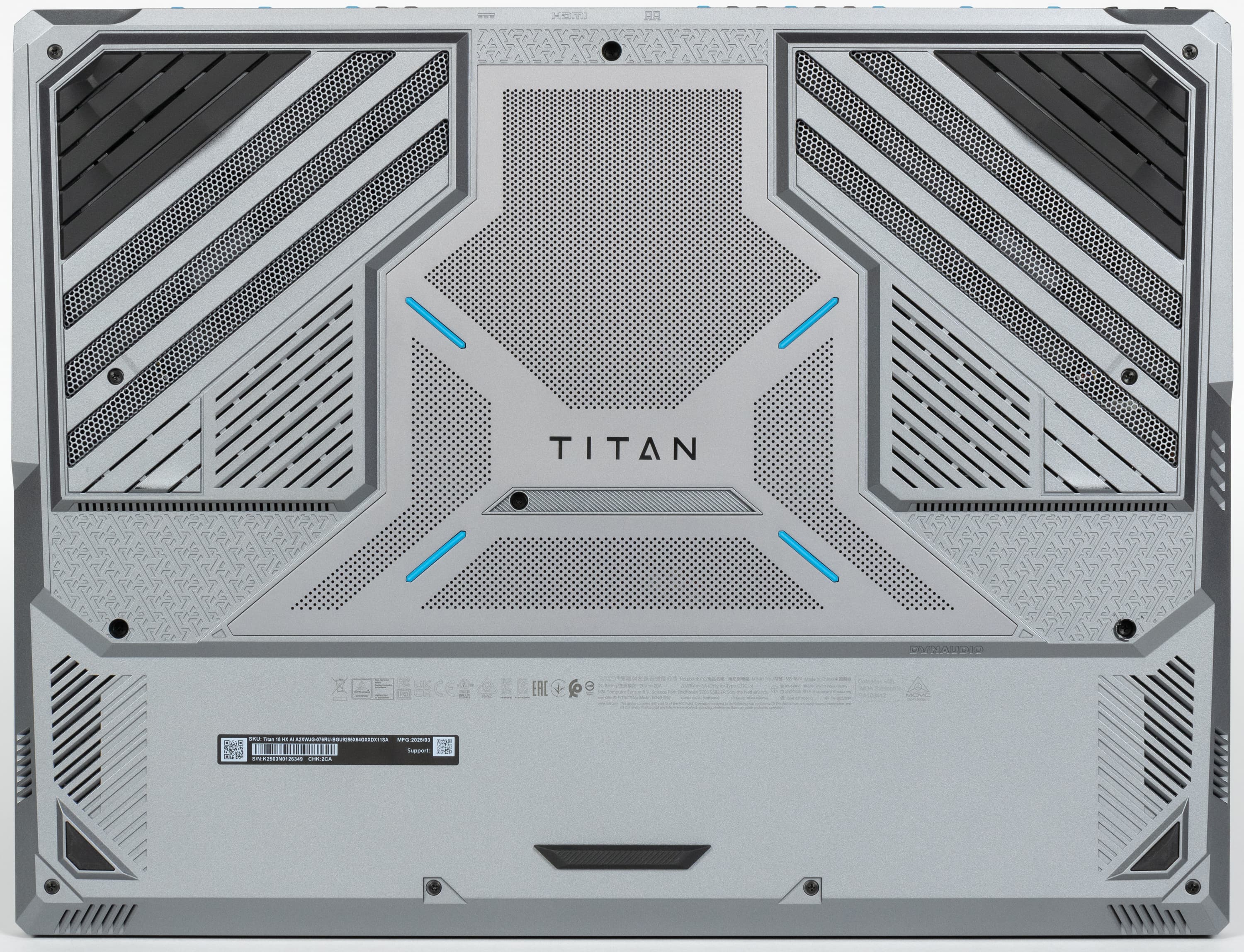 Характерной деталью компоновки игровых ноутбуков MSI Titan является выступающая задняя часть корпуса, где расположены решетки задних выходных трактов системы охлаждения, некоторые разъемы и подсвечивающиеся элементы. Для обособления этой зоны увеличен продольный размер корпуса, а крышка вместе с петлями отодвинута ближе к переднему краю машины, благодаря чему экран не нагревается «выхлопом» кулеров.