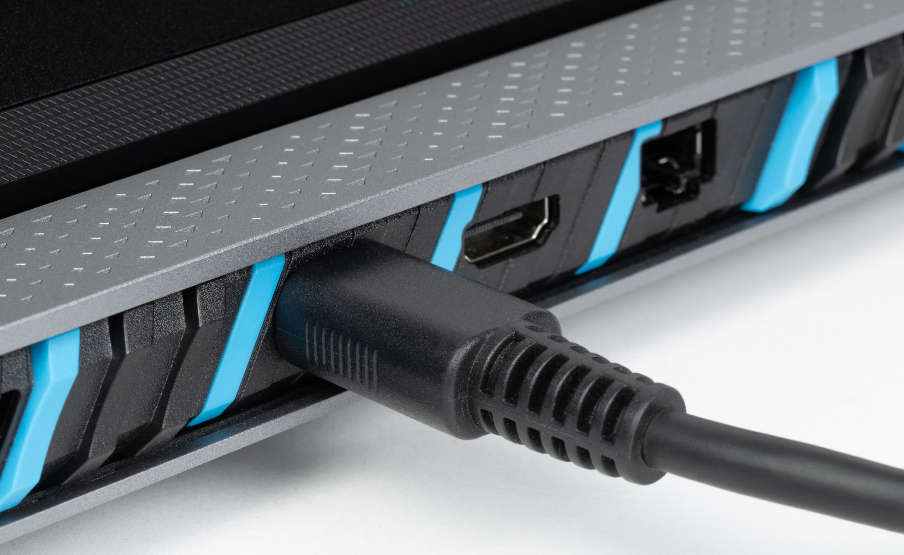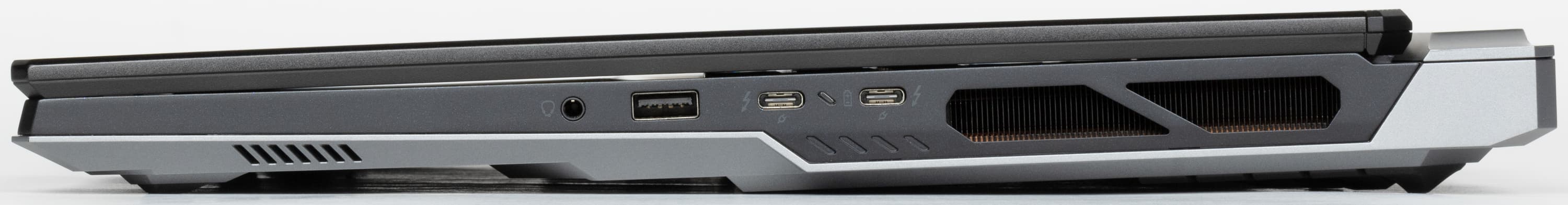 Справа имеется комбинированный аудиоразъем для подключения гарнитуры, порт USB 3.2 Gen2, два порта Thunderbolt 5 (Type-C) и четвертая боковая решетка выходного тракта системы охлаждения.
