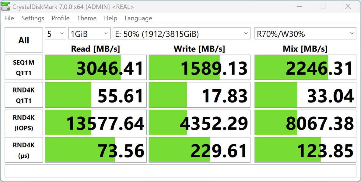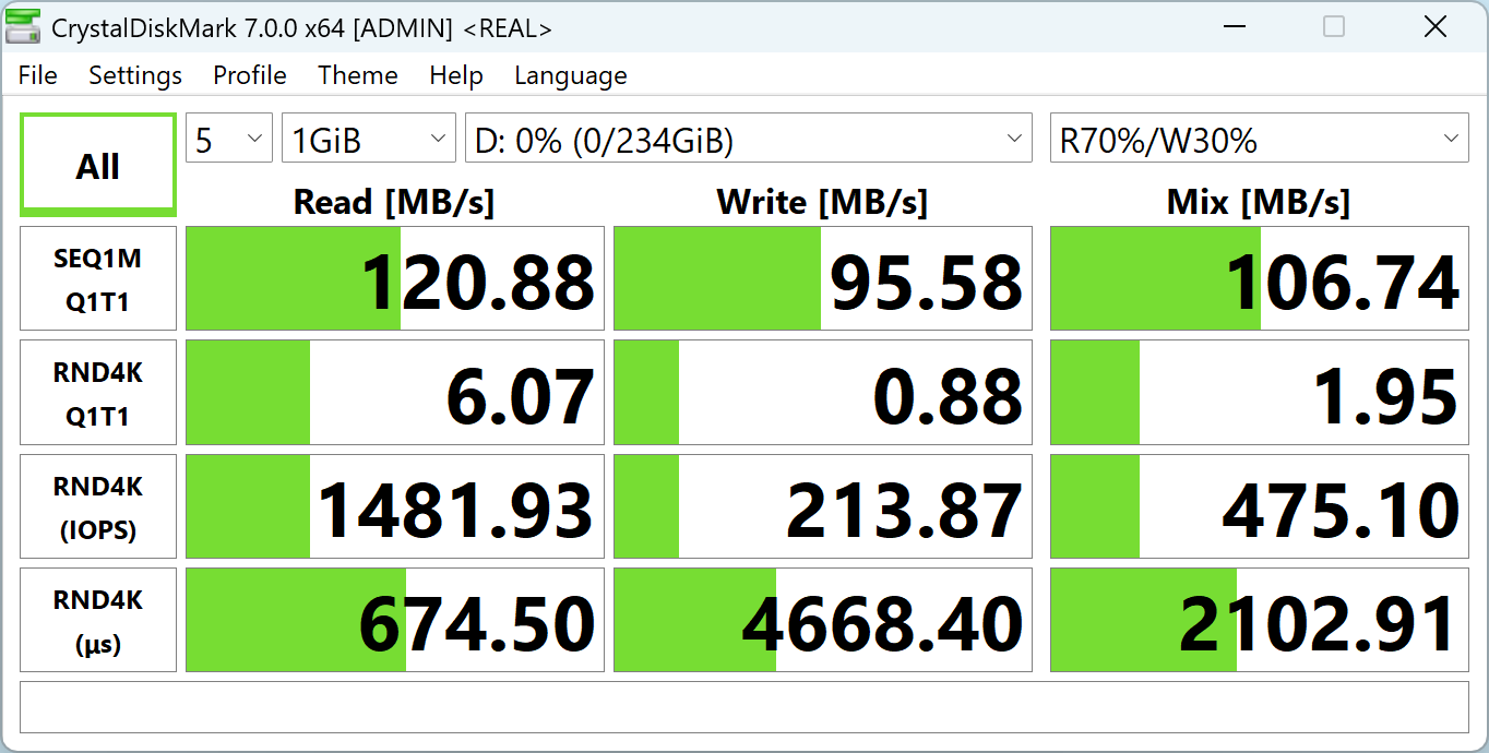 Скорость колеблется от 89 МБ/с до 1,2 МБ/с, и развертка скорости копирования по времени образует пилу со срезанными пиками. Это наглядно демонстрирует работу встроенного буфера. Максимальная скорость не соответствует пропускной способности USB 3.2 Gen2 (должно быть около 900 МБ/с). Впрочем, это отнюдь не самое главное. К тому же, как известно, «дареному коню...» и т.д.