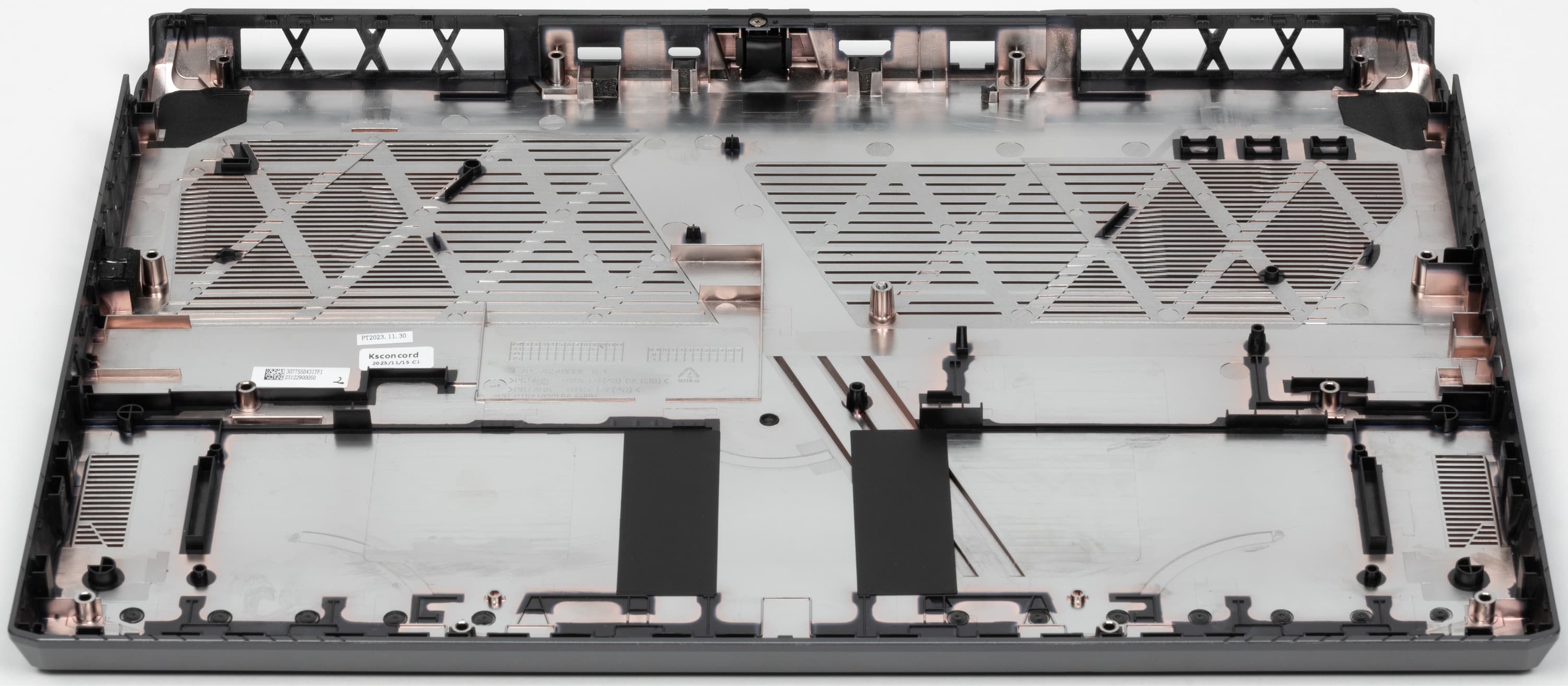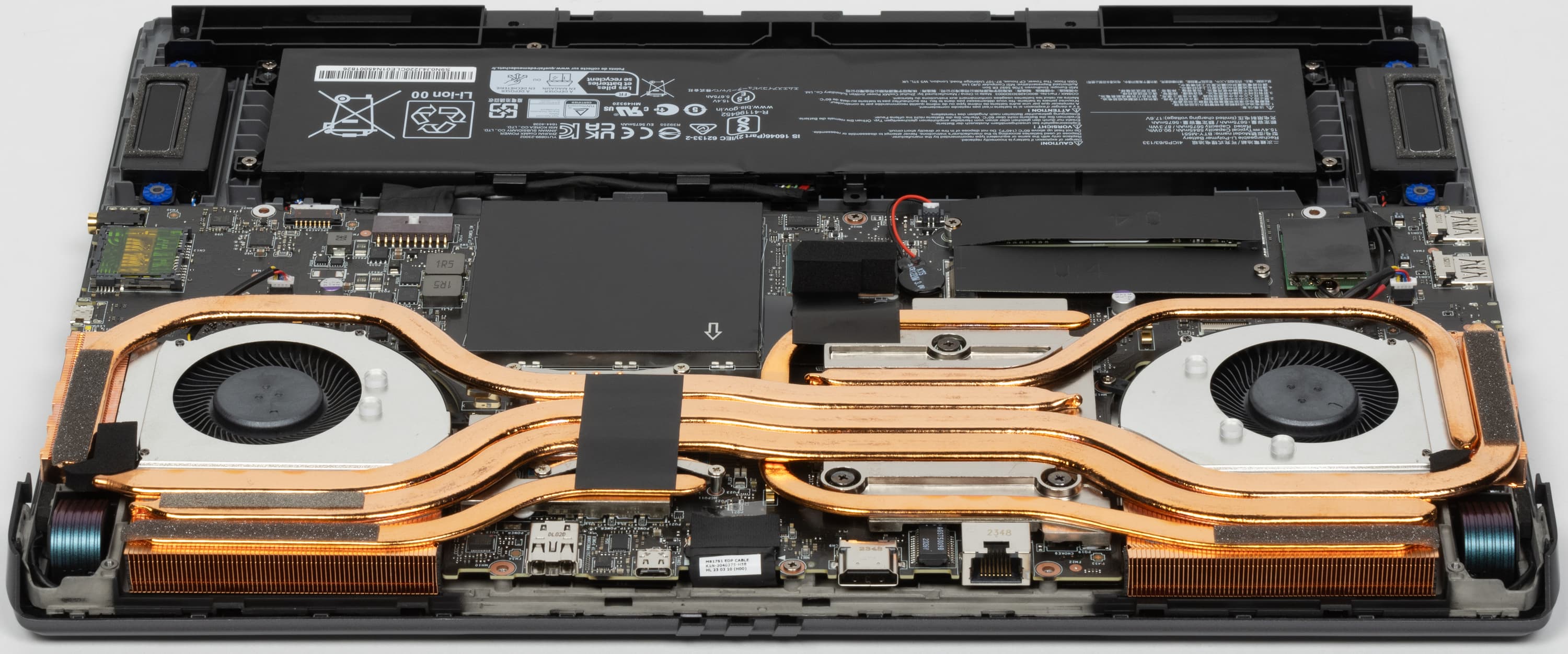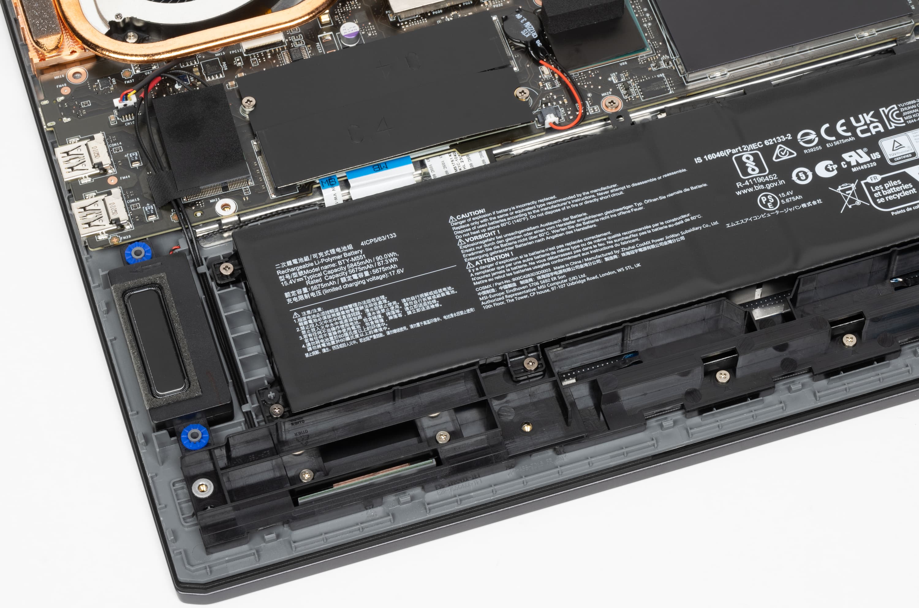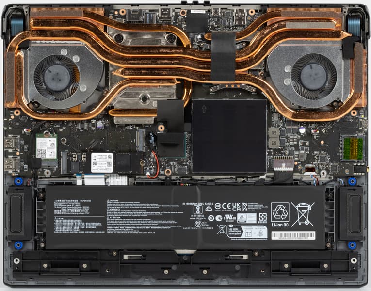 Во внутреннем объеме доминируют система охлаждения, блок со слотами SO-DIMM (на фото скрыт под почти квадратной накладкой) и аккумулятор. Системная плата цельная, однокомпонентная. Аппаратная модернизация предусматривает возможность изменения конфигурации оперативной памяти и добавление второго NVMe-накопителя в свободный слот M.2. Также можно заменить беспроводной адаптер и аккумулятор.