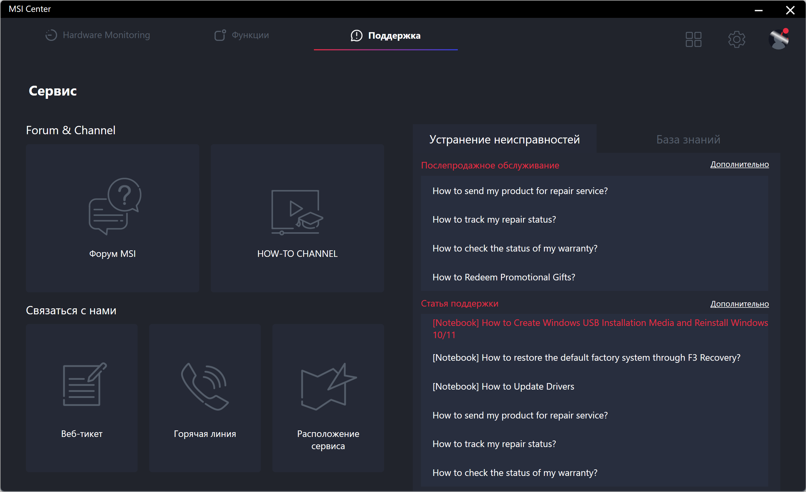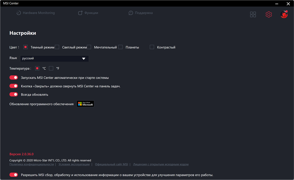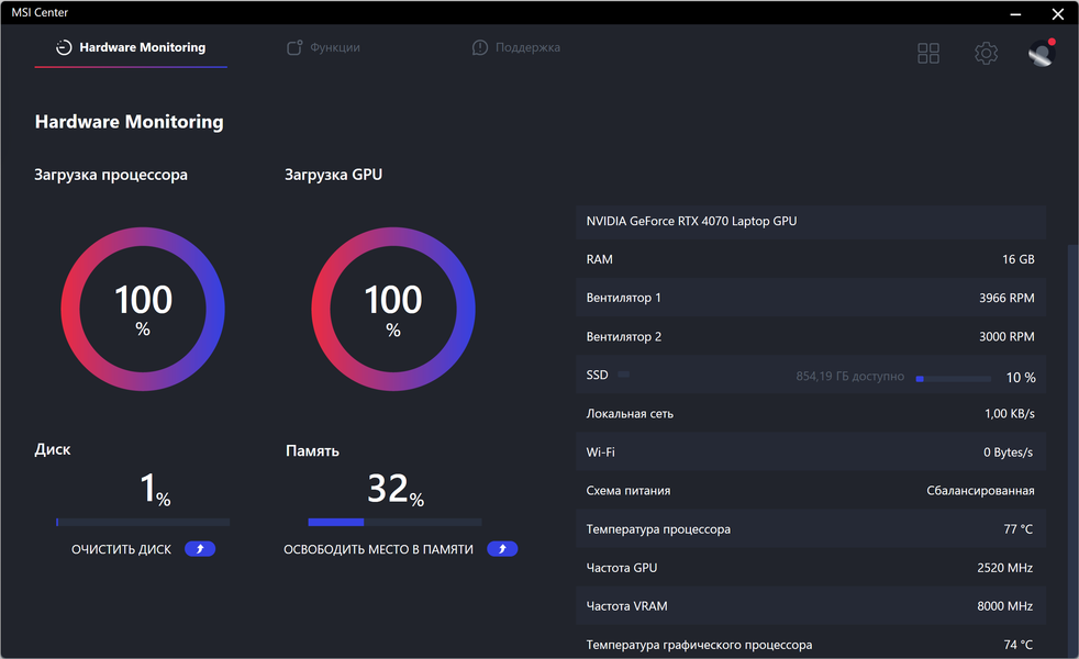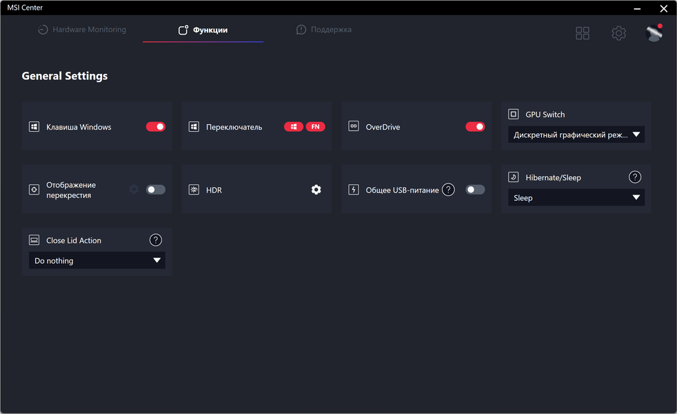 Основные опции сгруппированы в виде трех вкладок: Hardware Monitoring (системный монитор), «Функции» и «Поддержка». Первая позволяет определить загрузку CPU и GPU, заполненность системного накопителя и оперативной памяти, скорости вращения вентиляторов.