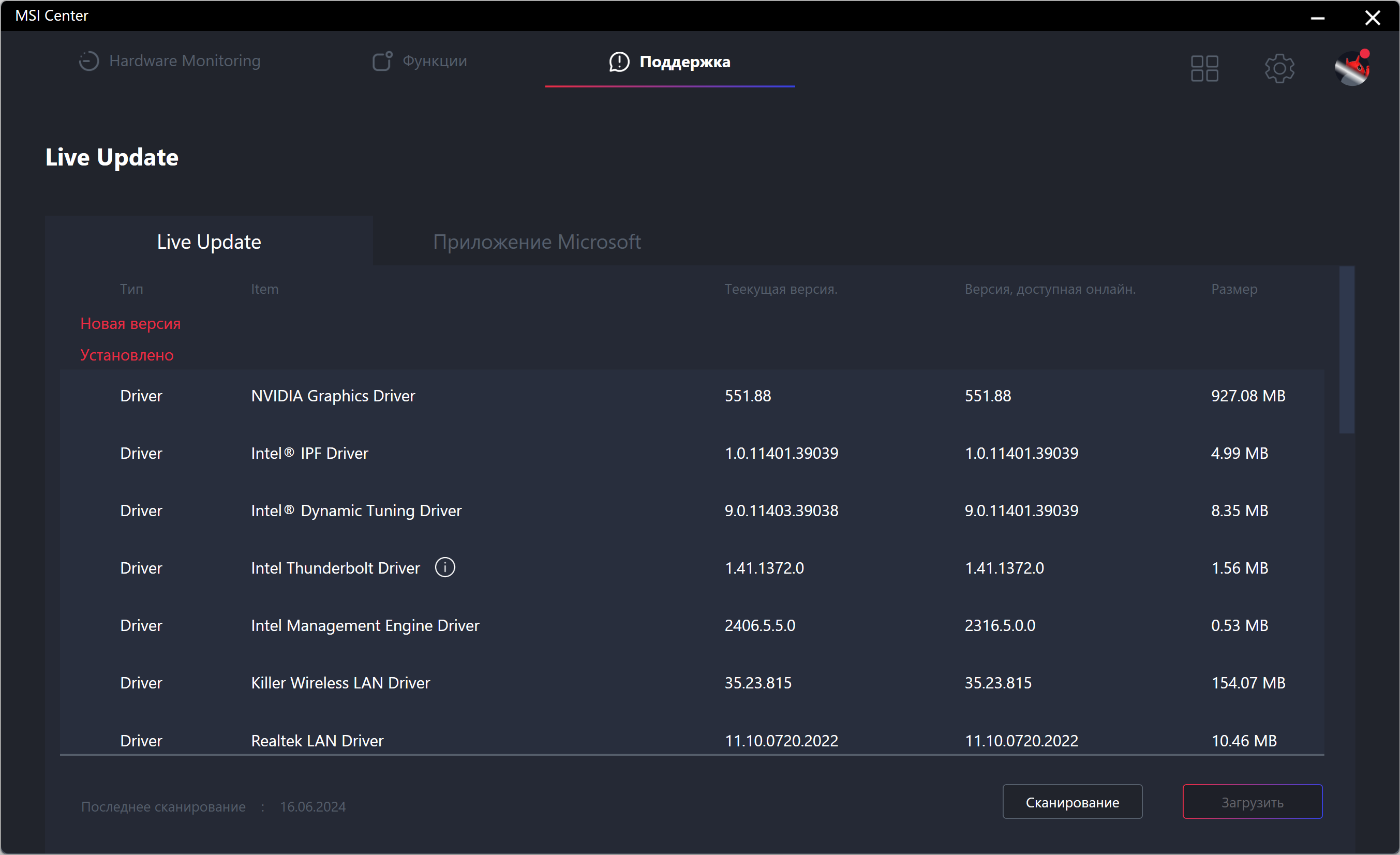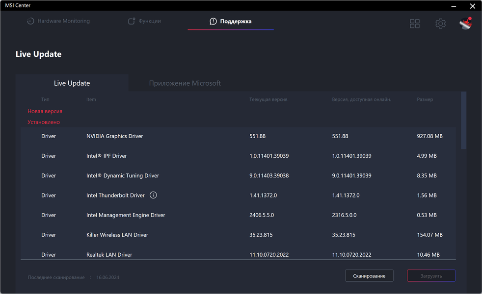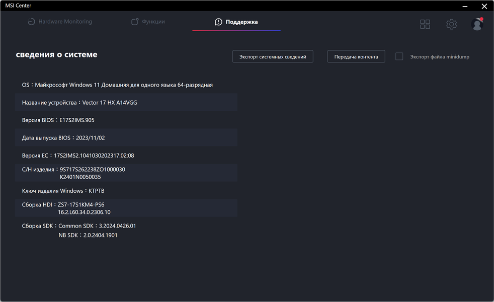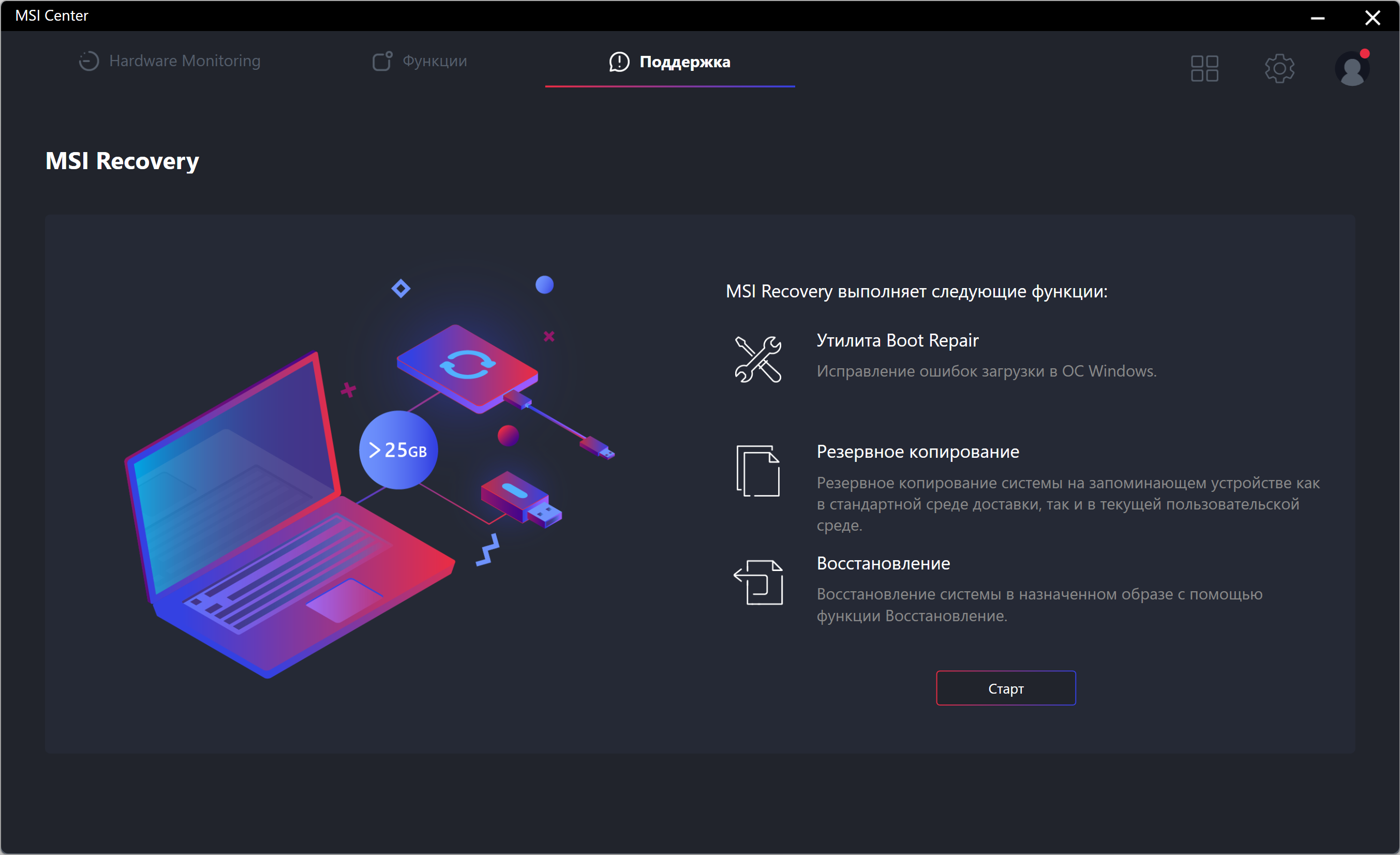 Основные опции сгруппированы в виде трех вкладок: Hardware Monitoring (системный монитор), «Функции» и «Поддержка». Первая позволяет определить загрузку CPU и GPU, заполненность системного накопителя и оперативной памяти, скорости вращения вентиляторов.