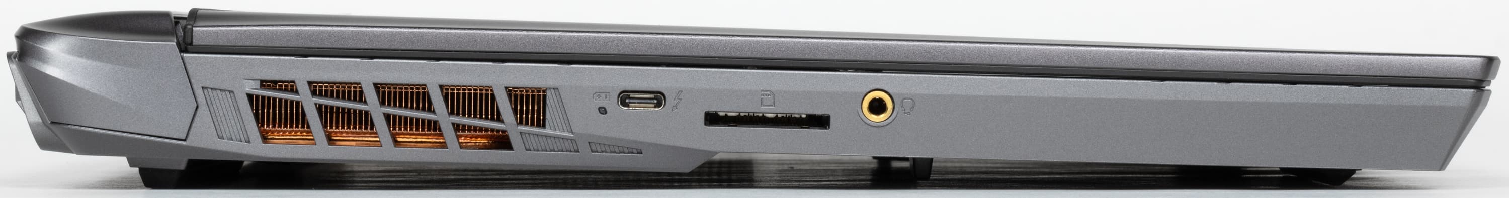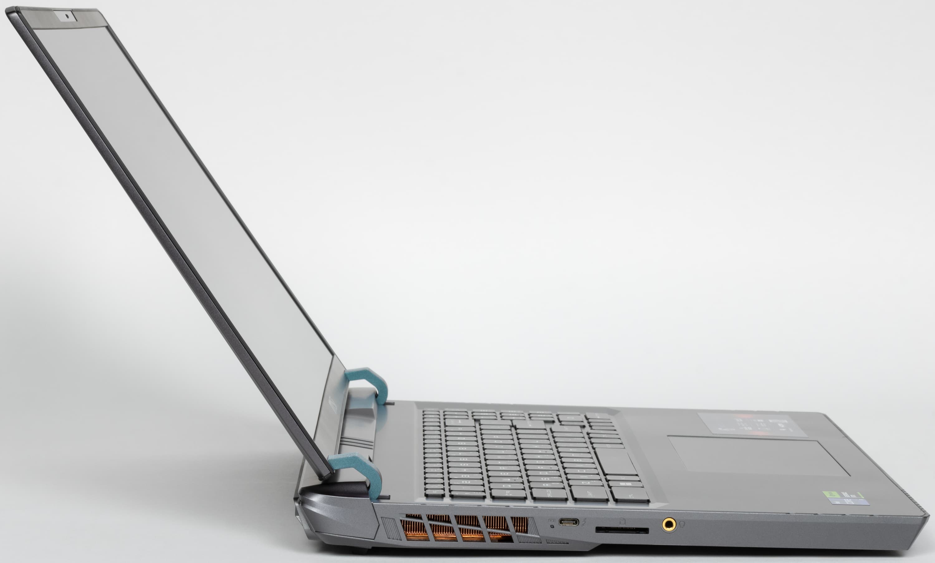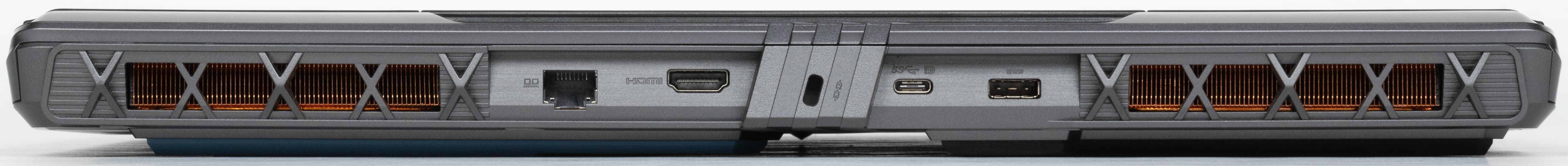 На задней панели слева и справа расположены массивные решетки, через которые из внутреннего объема ноутбука наружу эвакуируется нагретый воздух. Между ними располагаются розетка RJ-45, видеовыход HDMI, кенсингтонский замок, порт USB 3.2 Gen2 (с поддержкой DisplayPort) и проприетарный разъем для подключения адаптера питания.