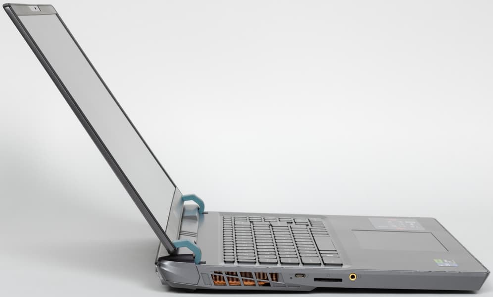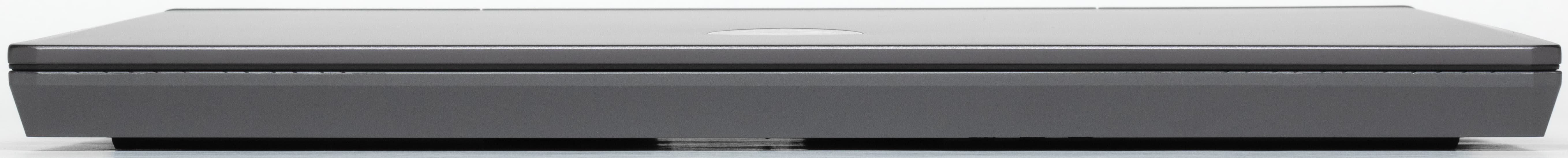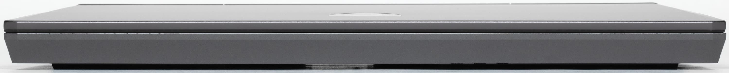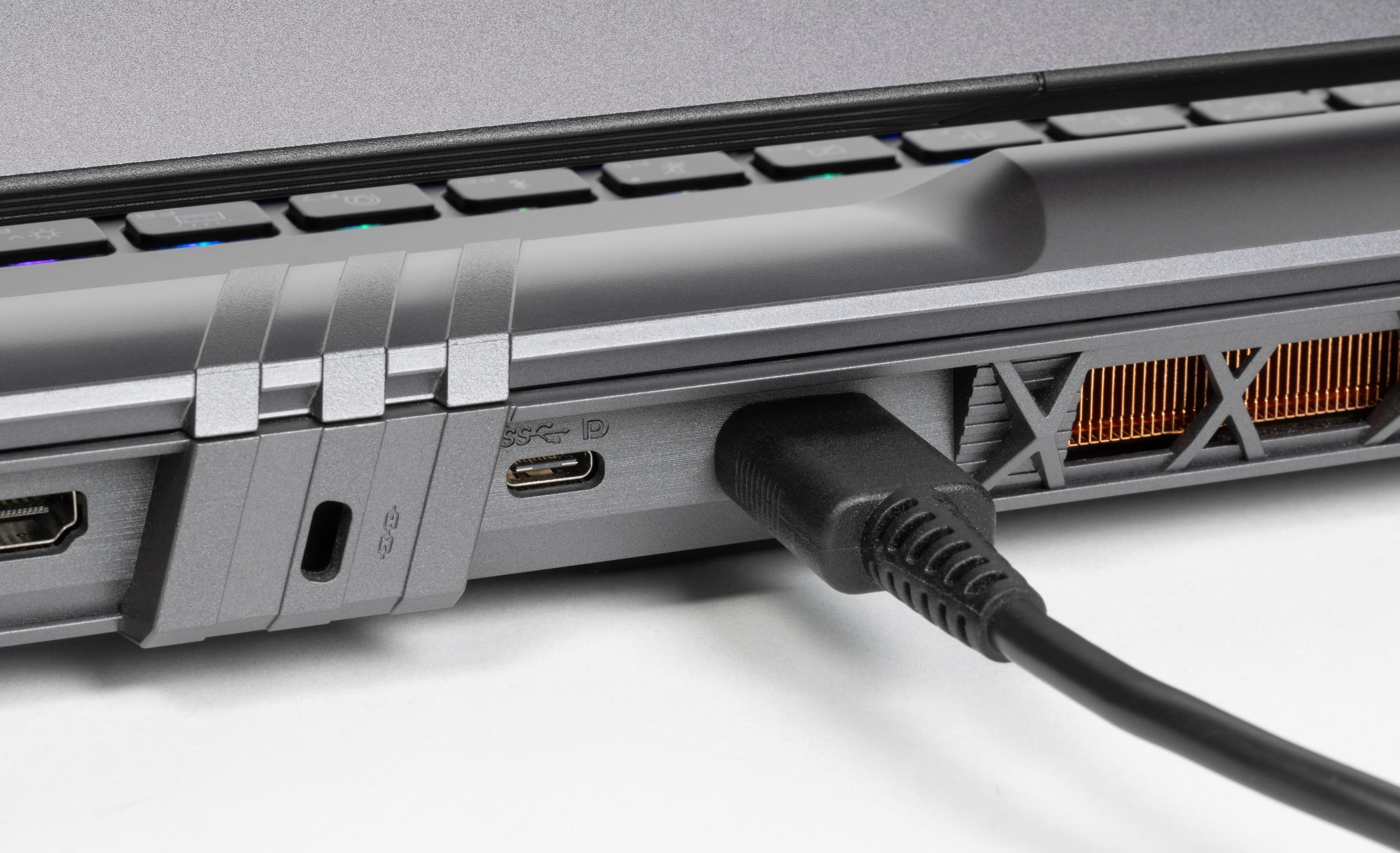 На задней панели слева и справа расположены массивные решетки, через которые из внутреннего объема ноутбука наружу эвакуируется нагретый воздух. Между ними располагаются розетка RJ-45, видеовыход HDMI, кенсингтонский замок, порт USB 3.2 Gen2 (с поддержкой DisplayPort) и проприетарный разъем для подключения адаптера питания.