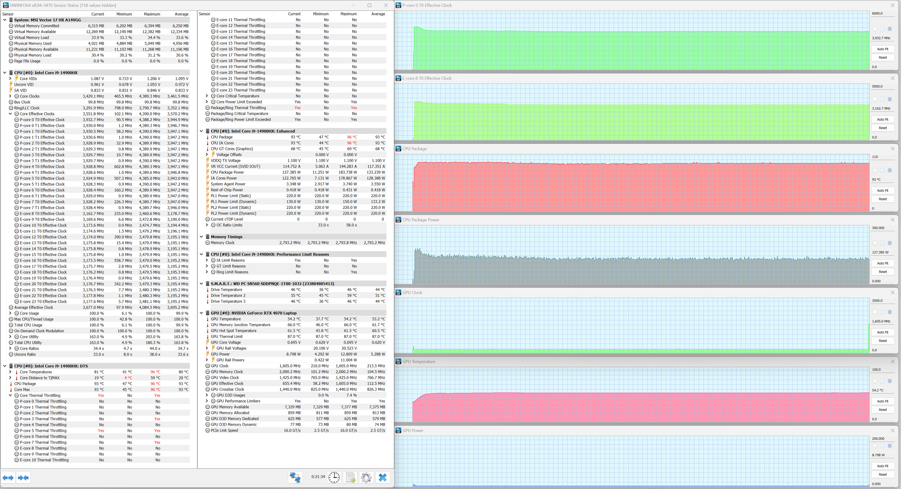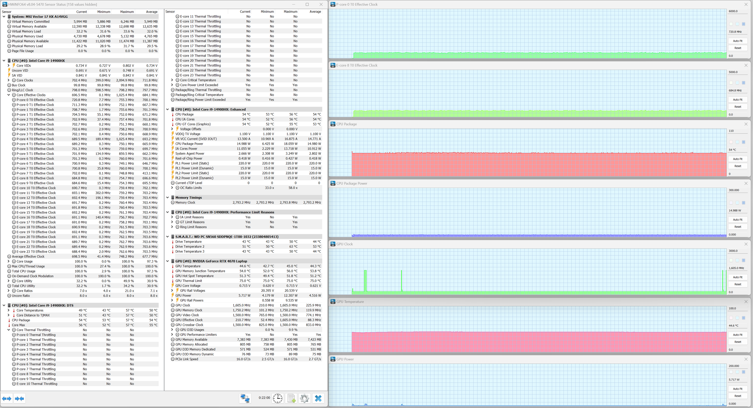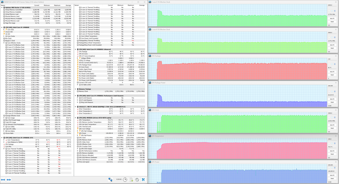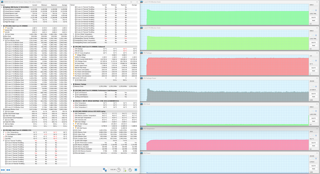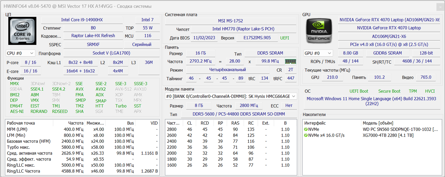 MSI Vector 17 HX A14VGG экипирован мобильным процессором Intel Core i9-14900HX (кодовое наименование Raptor Lake Refresh-HX) — это современное и одно из самых быстродействующих решений для портативных ПК. В его составе восемь двухпотоковых P-ядер (всего 16 потоков), работающих на базовой тактовой частоте 2,2 ГГц (при разгоне — до 5,8 ГГц), и шестнадцать однопотоковых E-ядер (16 потоков), работающих на базовой частоте 1,6 ГГц с возможностью разгона до 4,1 ГГц. TDP составляет 45—55 Вт (определяется производителем конечного устройства) и 157 Вт в турборежиме. Максимальная рабочая температура (Tjmax) — 100 °C. Низкоуровневые параметры центрального процессора представлены ниже на скриншоте утилиты HWInfo.