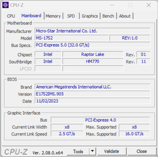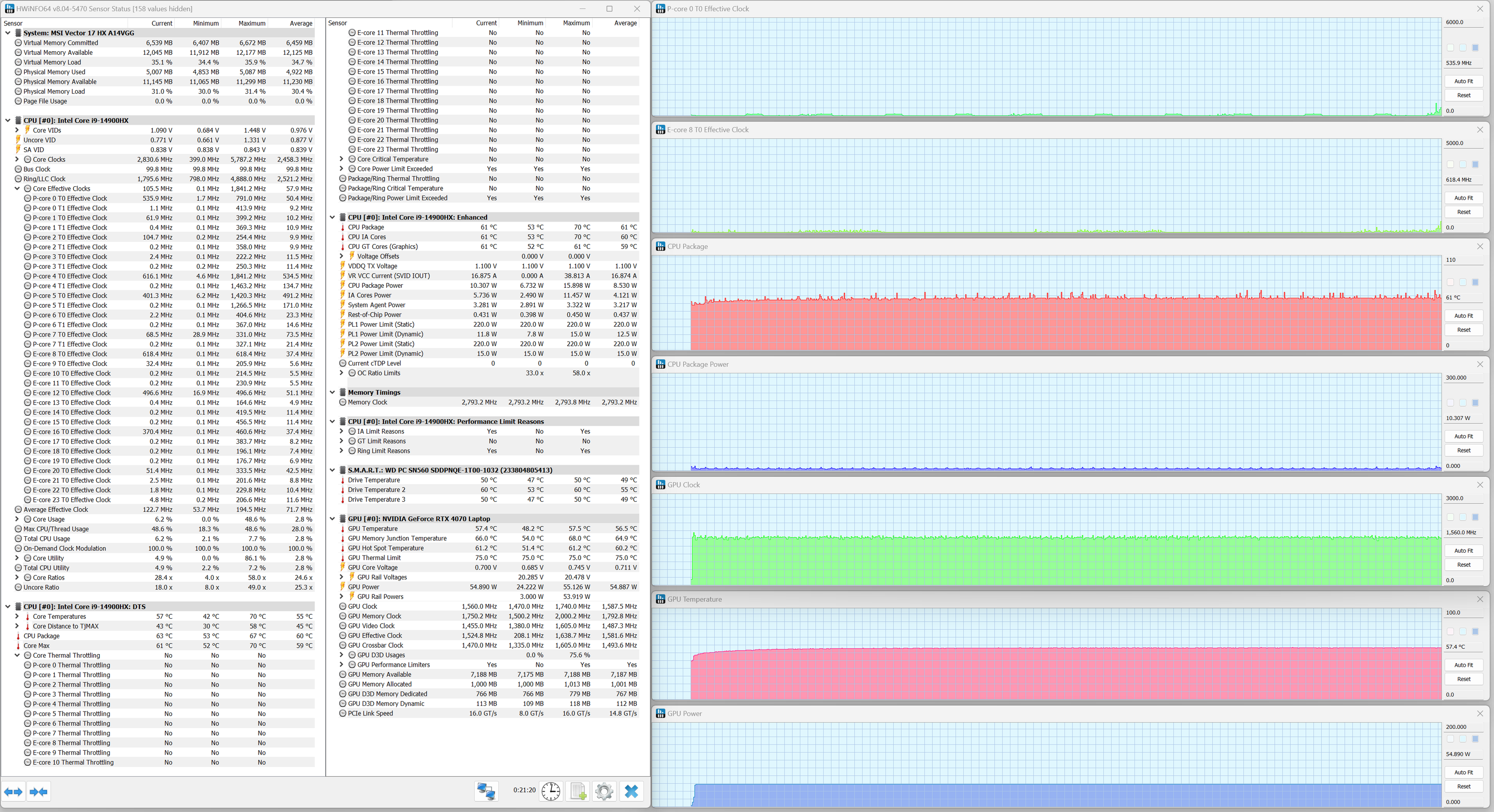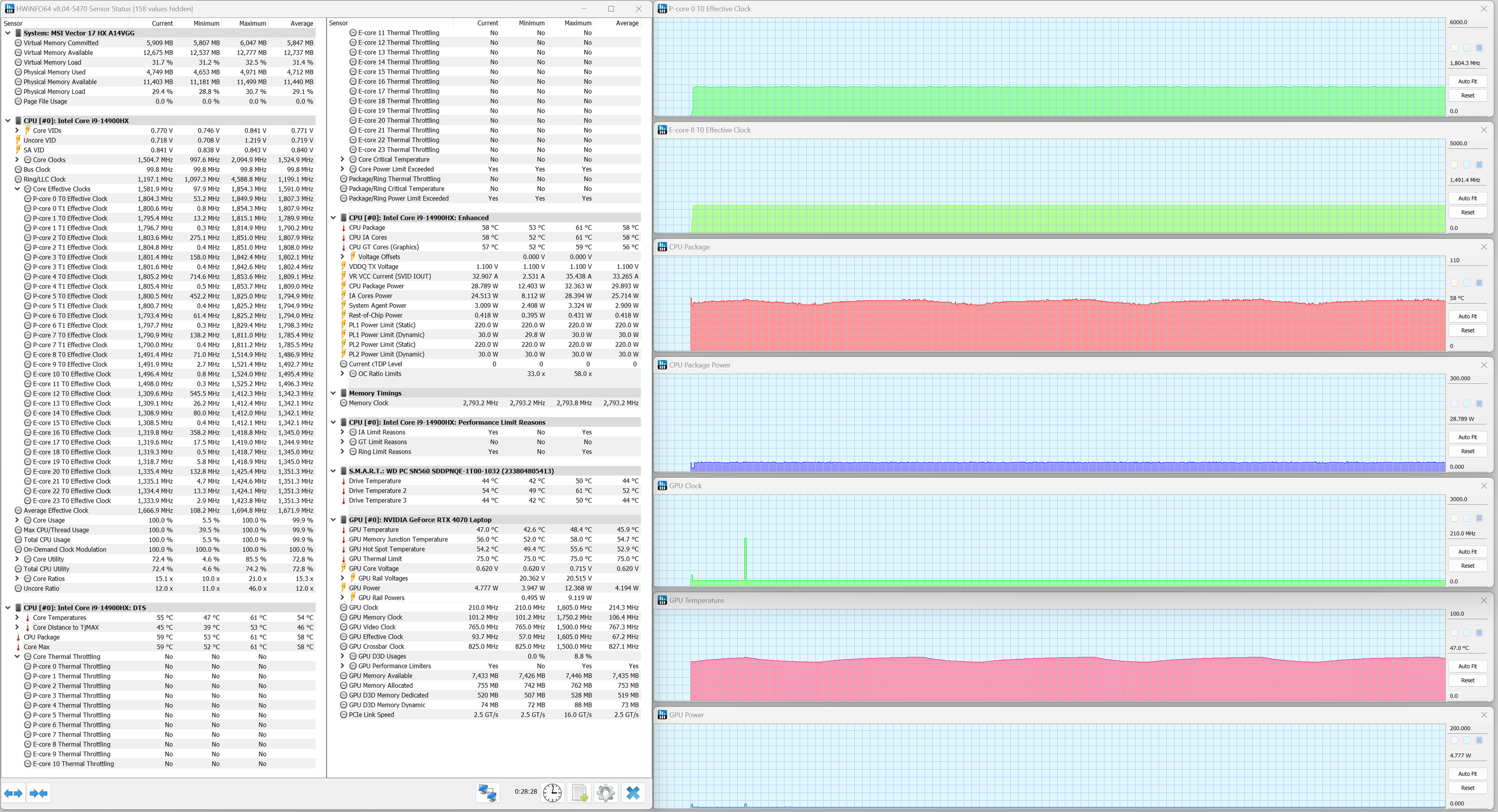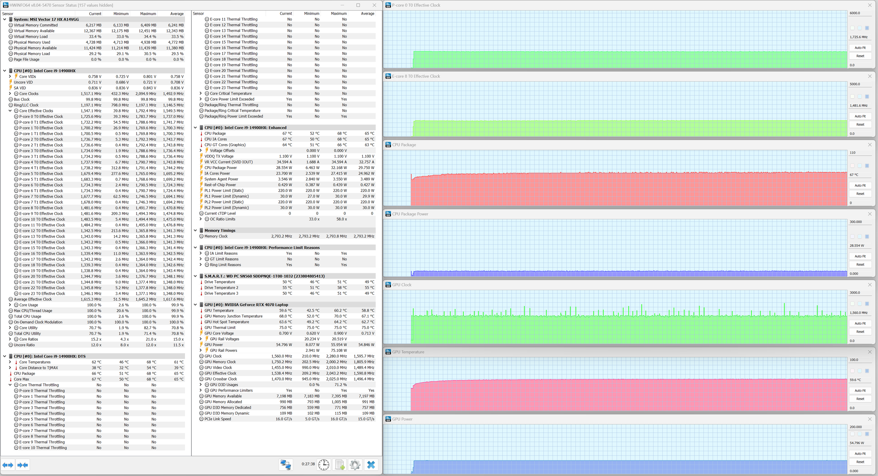 MSI Vector 17 HX A14VGG экипирован мобильным процессором Intel Core i9-14900HX (кодовое наименование Raptor Lake Refresh-HX) — это современное и одно из самых быстродействующих решений для портативных ПК. В его составе восемь двухпотоковых P-ядер (всего 16 потоков), работающих на базовой тактовой частоте 2,2 ГГц (при разгоне — до 5,8 ГГц), и шестнадцать однопотоковых E-ядер (16 потоков), работающих на базовой частоте 1,6 ГГц с возможностью разгона до 4,1 ГГц. TDP составляет 45—55 Вт (определяется производителем конечного устройства) и 157 Вт в турборежиме. Максимальная рабочая температура (Tjmax) — 100 °C. Низкоуровневые параметры центрального процессора представлены ниже на скриншоте утилиты HWInfo.