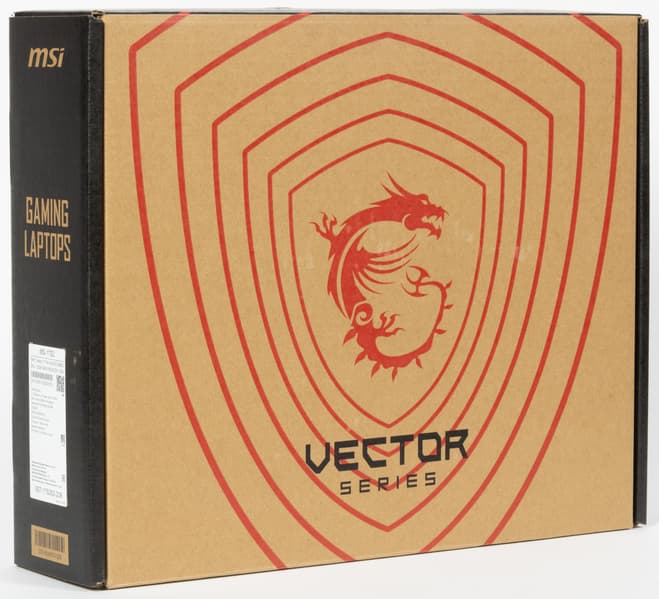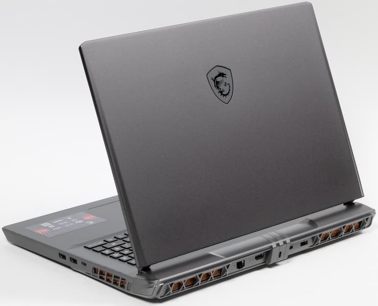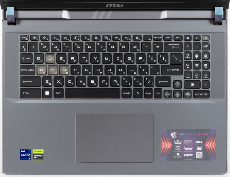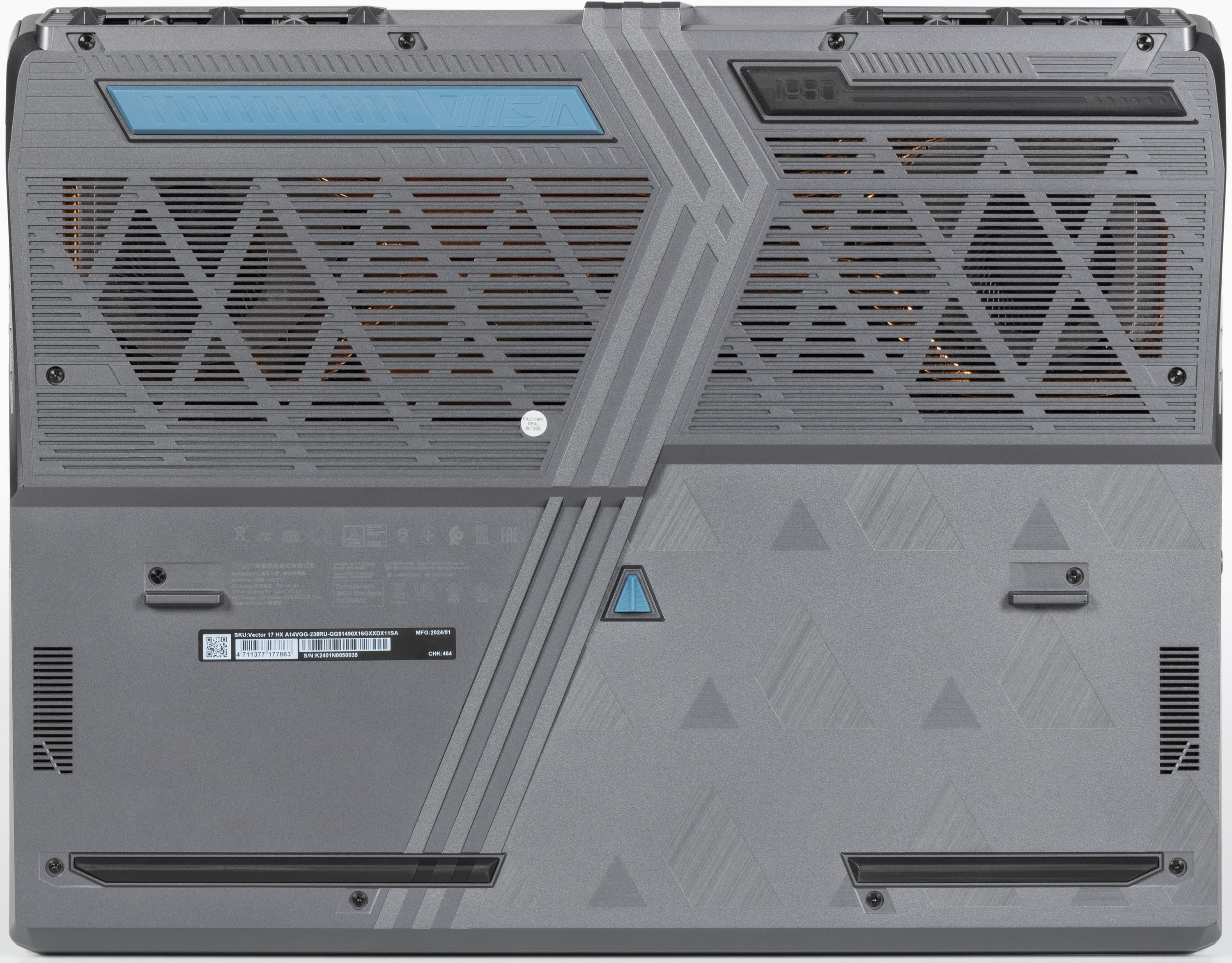 Крышка изготовлена из сплава алюминия и магния, а днище — из ударопрочной пластмассы. Все поверхности обладают шероховатой фактурой и неплохо противостоят появлению на них отпечатков пальцев. Особым признаком компоновки MSI Vector 17 HX A14V является выступающая задняя часть корпуса, которая содержит внутри себя два задних радиатора системы охлаждения, и где при складывании ноутбука скрываются хотя и не металлические, а пластмассовые, но довольно массивные петли. На крышке красуется привычный логотип игровой серии MSI в виде дракона. В рабочем состоянии он не подсвечивается.