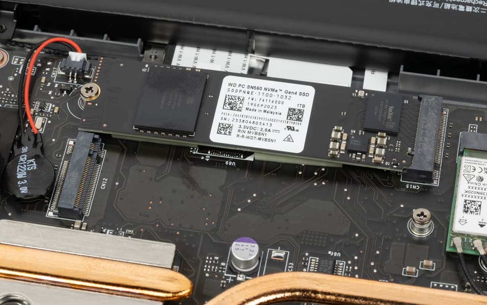 Системным хранилищем программ и данных является NVMe-накопитель Western Digital WD PC SN560 емкостью 1 ТБ с интерфейсом подключения PCIe 4.0 ×4. Под ним имеется второй (свободный) слот M.2 с аналогичными характеристиками интерфейса, в который при аппаратной модернизации можно установить еще один накопитель.