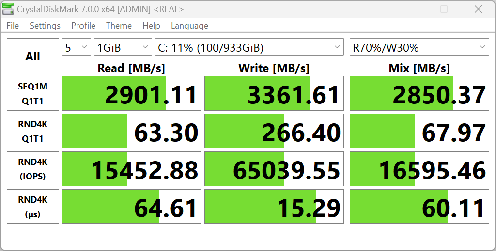 Системный накопитель героя обзора оставляет позади конкурента Maibenben X639, а с MSI Titan GT77 HX13VI соперничает неплохо, хотя и уступает ему по скорости последовательного чтения.
