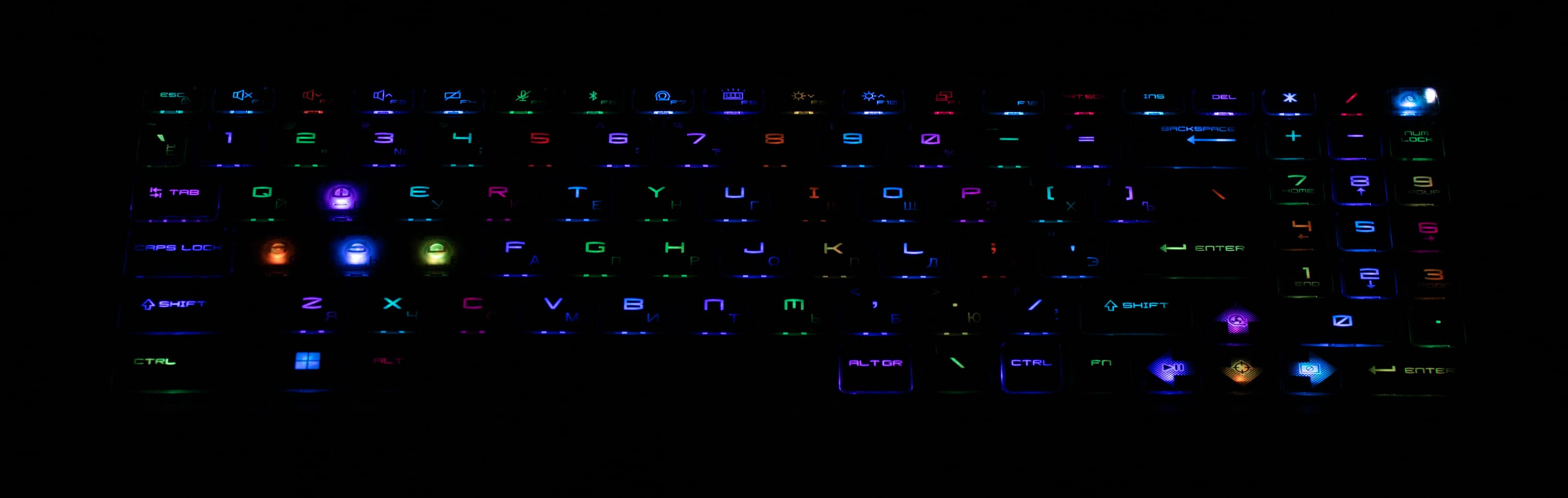 Клавиатура оснащена подсветкой с поддержкой переходов и переливов с тремя уровнями яркости. Переключение производится последовательными аккордами «Fn+F8». Подсвечиваются символы на клавишах и немного — их контуры. Зона подсветки под каждой клавишей видна хорошо, но выражена не сильно, поэтому не раздражает. Распределение света и специфика маркировки позволяют хорошо видеть только латинские символы.