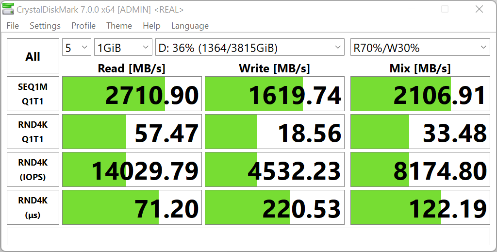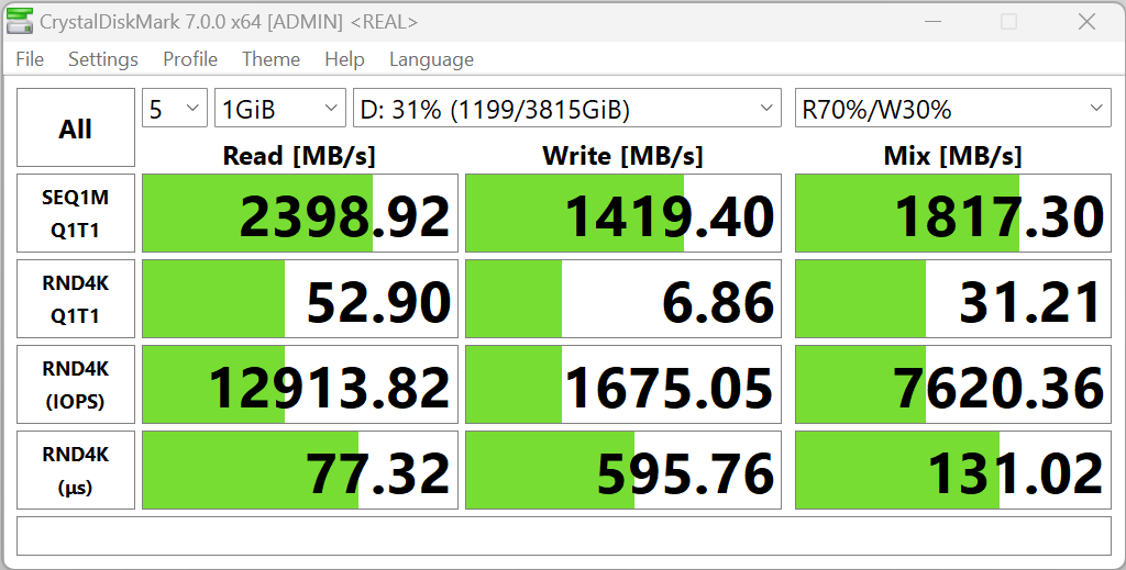 Теоретического максимума 3000 МБ/с достичь не удалось, однако полученные показатели мы считаем очень хорошими. Для сравнения приведем аналогичные значения, полученные с корпусом Maiwo и тем же самым накопителем при подключении к Thunderbolt 4 ноутбука MSI Titan GT77 HX 13VI.