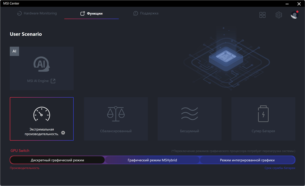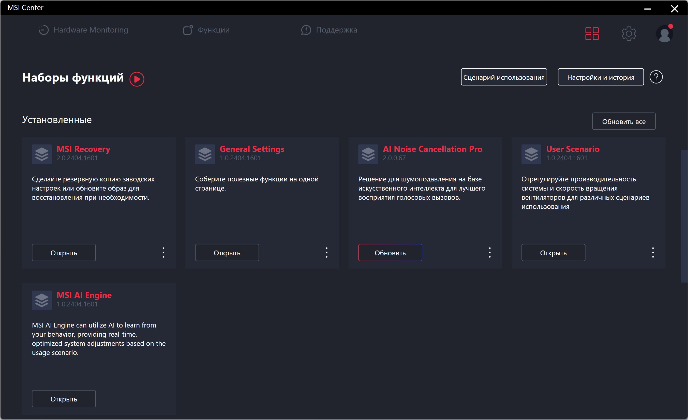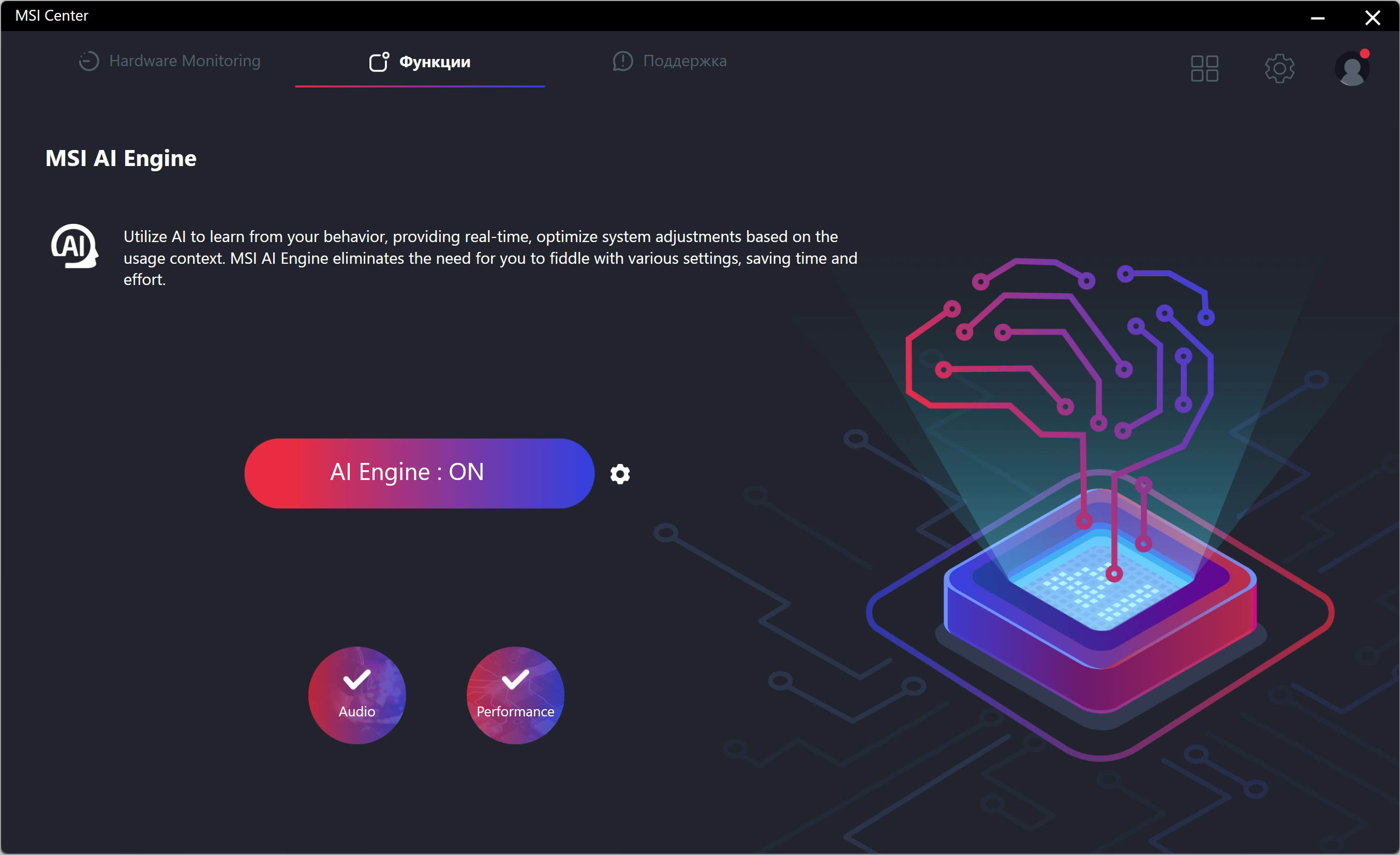 В разделе «Функции» имеются четыре компонента: MSI AI Engine, модуль оптимизации настроек с помощью технологий искусственного интеллекта (ИИ). Согласно уверениям производителя, MSI AI Engine производит анализ условий работы и самостоятельно подстраивает параметры под текущий сценарий использования...
